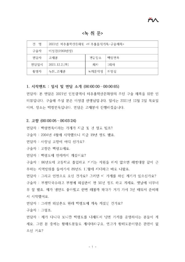 • 구술내용 요약 : 88년에 인천으로 올라와 외삼촌께 3년 배우고 준비해 2004년에 장사를 시작함, 백령도에서 나는 메밀을 사용중, 까나리 액젓을 넣으면 시원한 맛이 남, 육수는 한우뼈를 사용, 짠지떡은 백령도에서 겨울 명절 때 해먹는 음식임, 고향의 맛을 찾아오시는 어르신들을 보면 보람을 느낌, 가게에 내용과 이야기를 담으려고 노력하고 있음.
