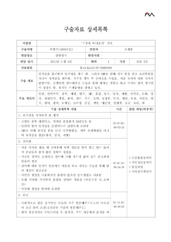 • 구술내용 요약 : 일식집을 물려받아 일식집을 하게 됨. 그러나 IMF로 인해 가게 문을 닫고 요리학원을 다니며 자격증을 취득함. 자격증 취득 후 선어집을 차렸음. 처음 선어에 대한 지식이 없었지만, 오랫동안 찾아와주신 분들을 통해 현재는 경험도 많고 지식도 많이 생기면서 성장도 함. 현재는 가게운영을 잘하고 있음.