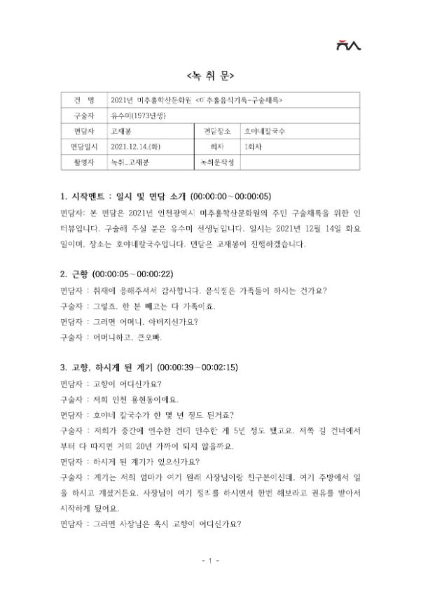 • 목 적 : 미추홀구가 도시개발로 매립이 되기 전 바다를 담고 있는 미추홀의 음식문화를 기록하기 위해 구술인터뷰 진행
