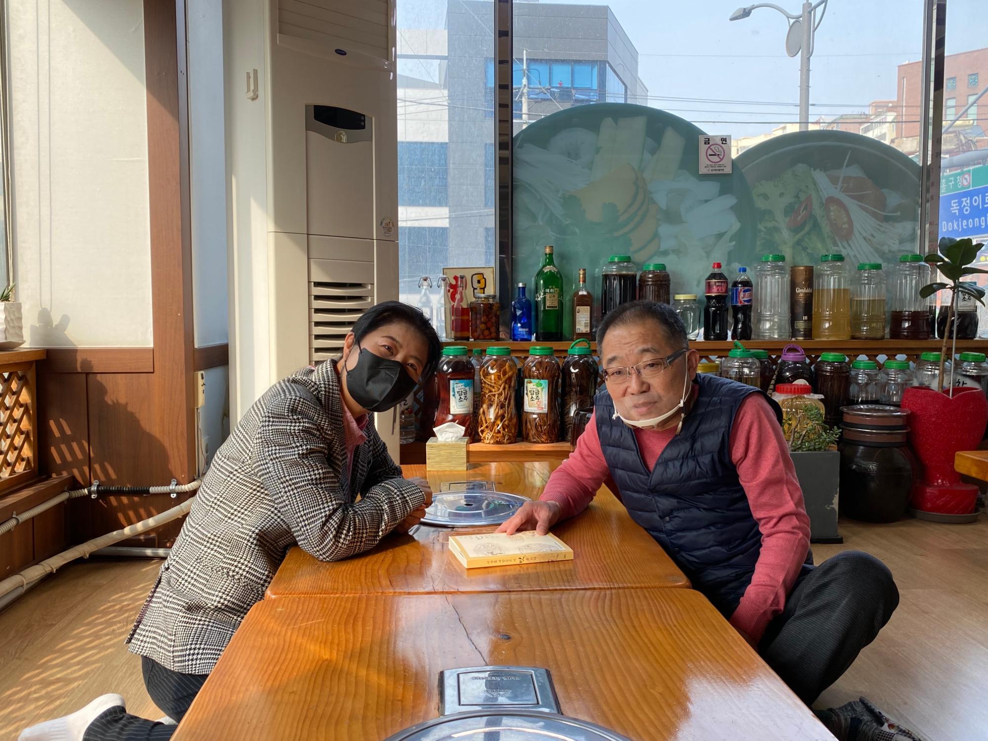 [미추홀, 살아지다5 미추홀 사람들은 이 맛을 안다] 중 메밀국수 부분을 구술해주신 마루메밀 박형일 사장님께 당시 면담을 진행했던 시민기록단 이혜숙님이 도서를 전달한 모습이다.