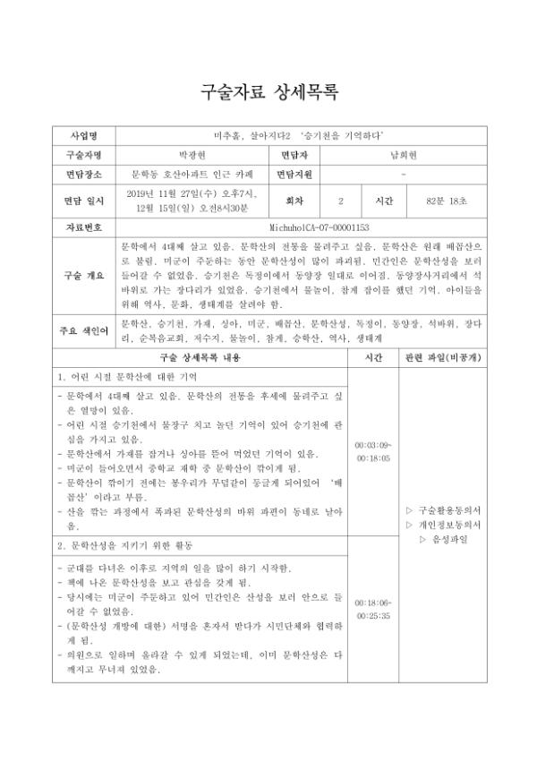 | 변경전 내용 | • 주 제 : 승기천에 대한 기억 • 목 적 : 인천 도심을 관통하는 유일한 하천인 '승기천'의 기록을 남겨 지역의 정체성을 찾아가고자 기록 • 구 술 자 : 박광현 • 면 담 자 : 남희현 • 면담일자 : 1차 2019년 11월 27일(수) 오후7시 : |