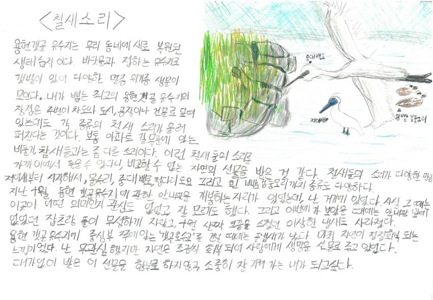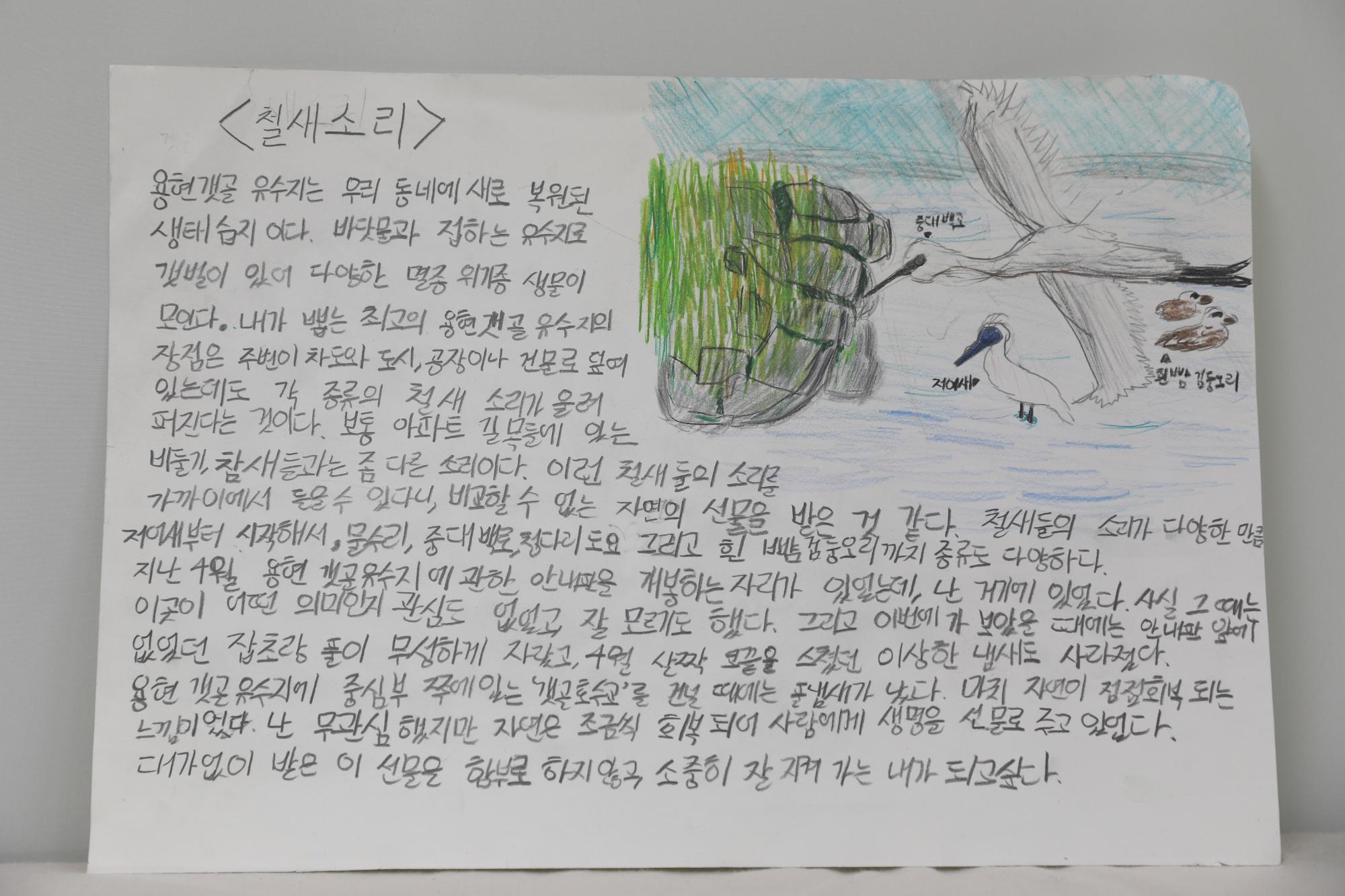 용현갯골에서 본 중대백로, 저어새 그리고 흰뺨검둥오리의 모습을 그림으로 그렸다. 또한, 지난번에 왔을 때 보다 자연이 회복되고 있음을 느꼈고, 소중히 잘 지켜나가야겠다는 글을 적었다.
