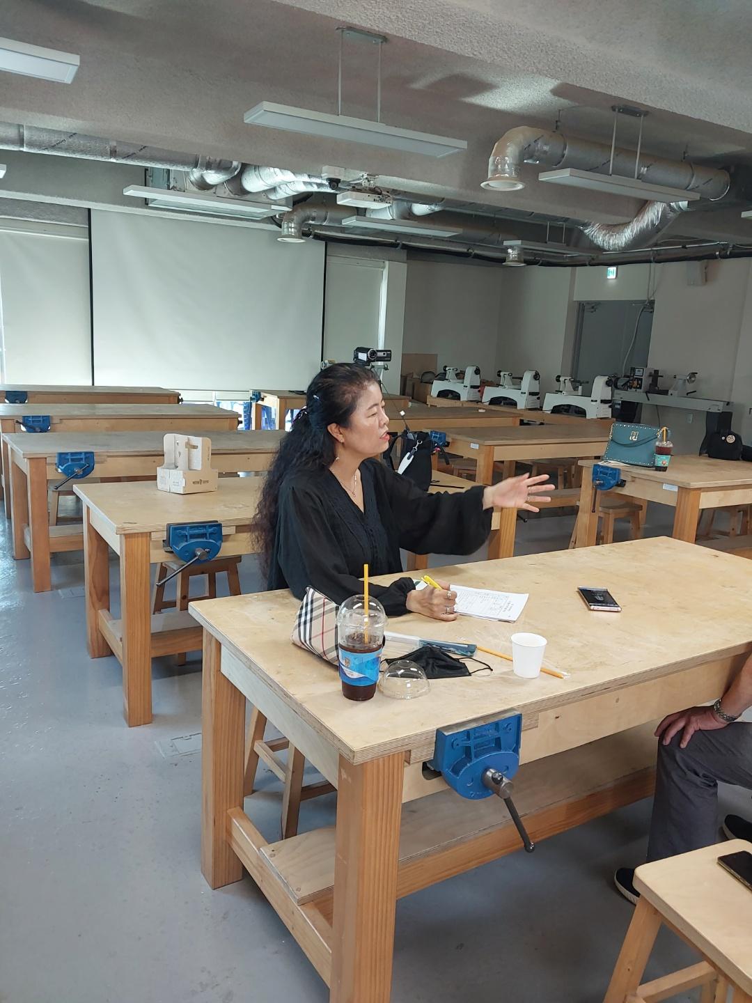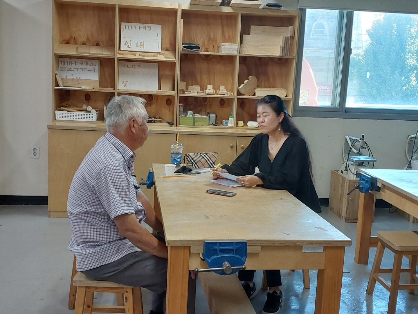 2022년 숭의목공예마을 기록을 위해 미추홀시민기록단 이혜숙님이 서울공예사 사장님을 인터뷰하는 모습이다. 목공 직업을 주제로 사장님의 삶을 함께 기록하였다.