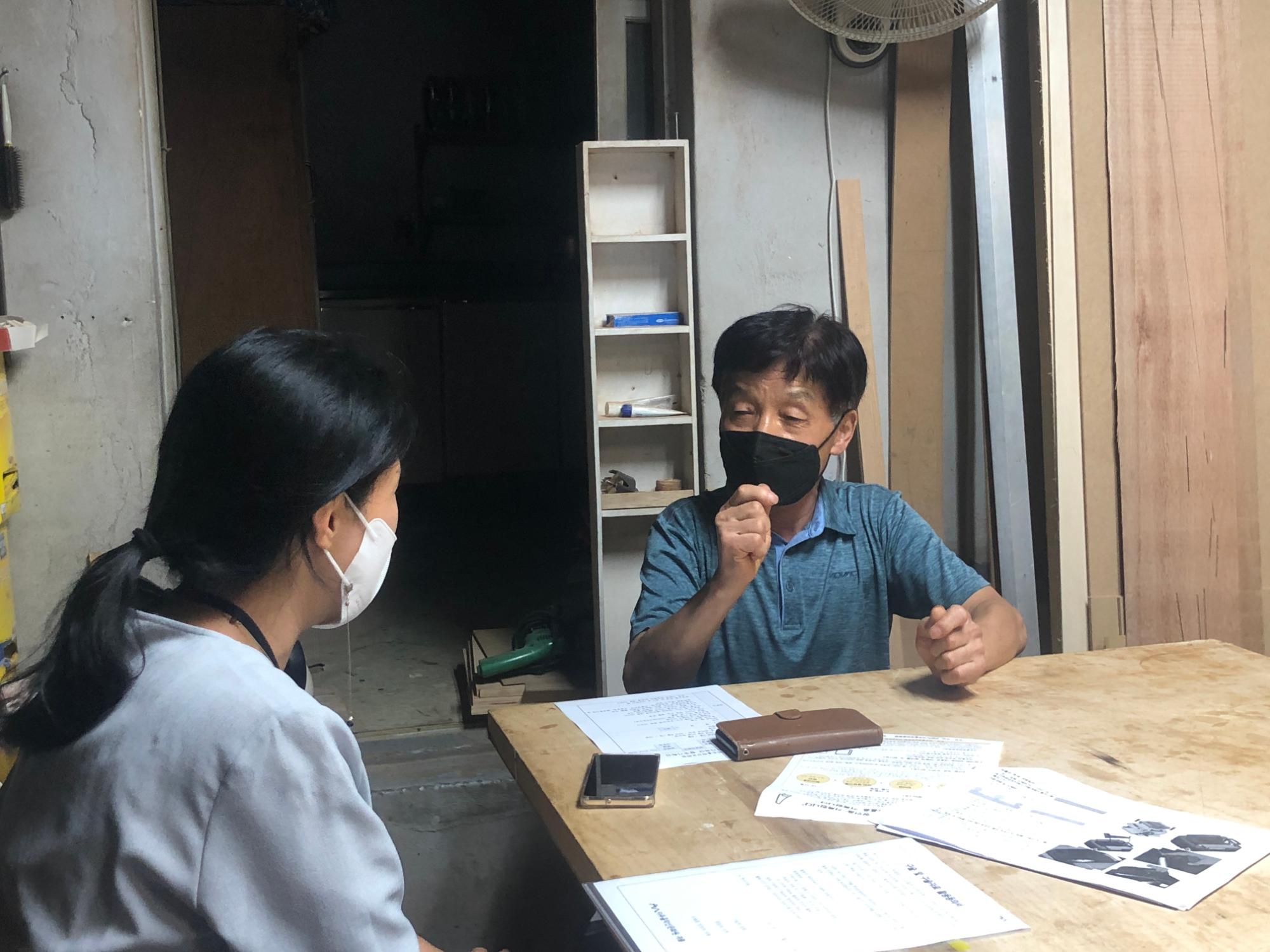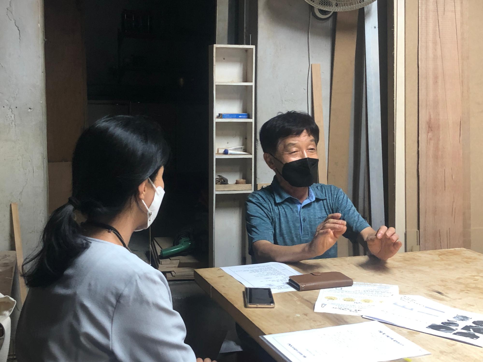 2022년 숭의목공예마을 기록을 위해 미추홀시민기록단 정지선님이 고려목공소 사장님을 사전면담하는 모습이다. 본 인터뷰를 하기 전 기본 정보를 파악하였다.