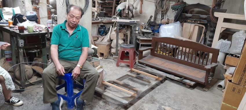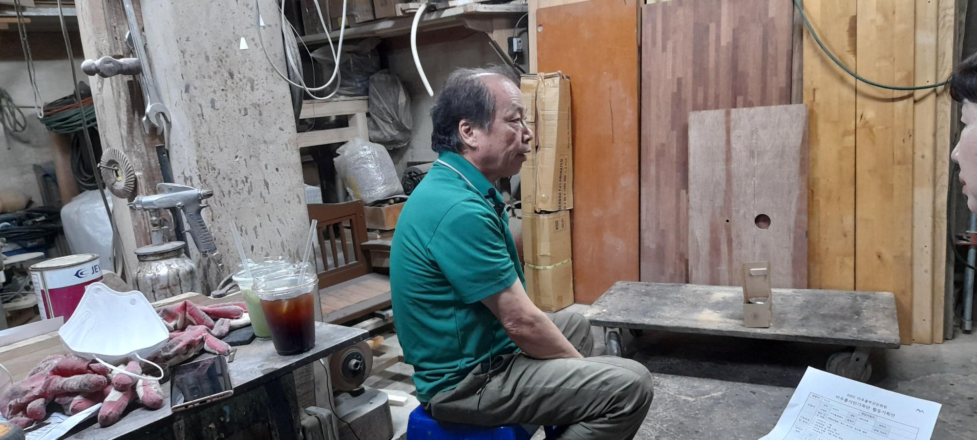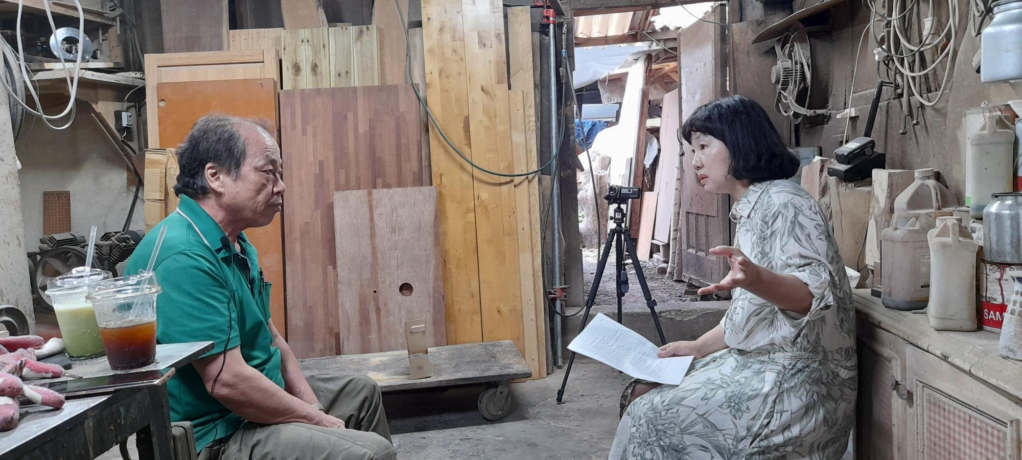 2022년 숭의목공예마을 기록을 위해 미추홀시민기록단 허은영님이 미추홀공예사 사장님을 인터뷰하는 모습이다. 목공 직업을 주제로 사장님의 삶을 함께 기록하였다.