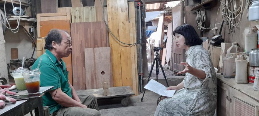 2022년 숭의목공예마을 기록을 위해 미추홀시민기록단 허은영이 미추홀공예사 김인규 사장을 인터뷰하는 모습이다. 목공 직업을 주제로 구술자의 삶을 함께 기록하였다.