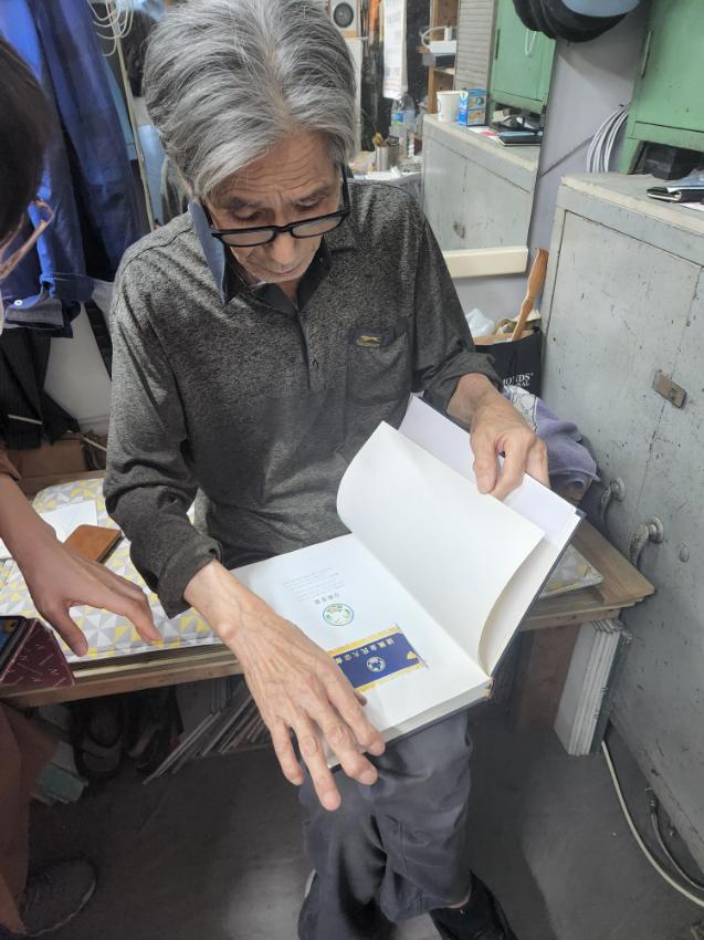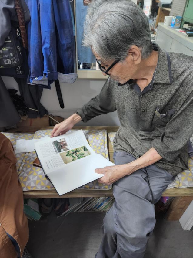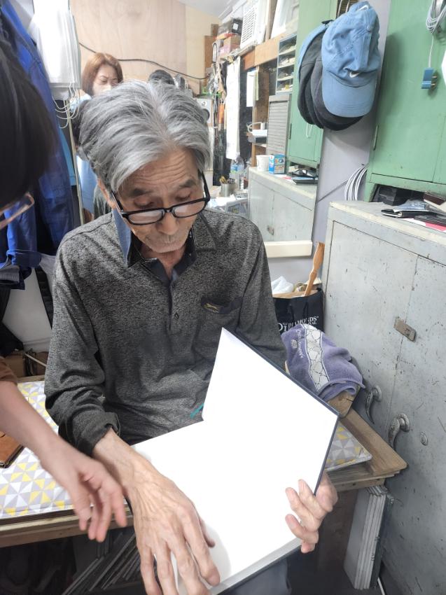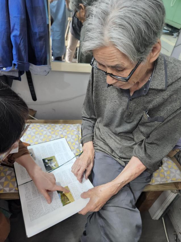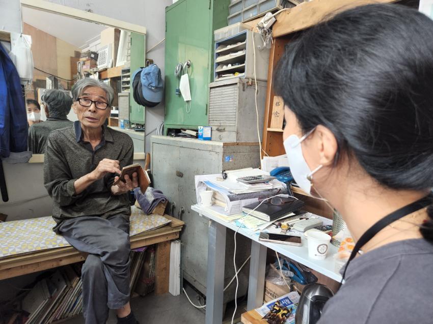 2022년 숭의목공예마을 기록을 위해 미추홀시민기록단 정지선님이 유성톱연마 사장님을 인터뷰하는 모습이다. 직업을 주제로 사장님의 삶을 함께 기록하였다.