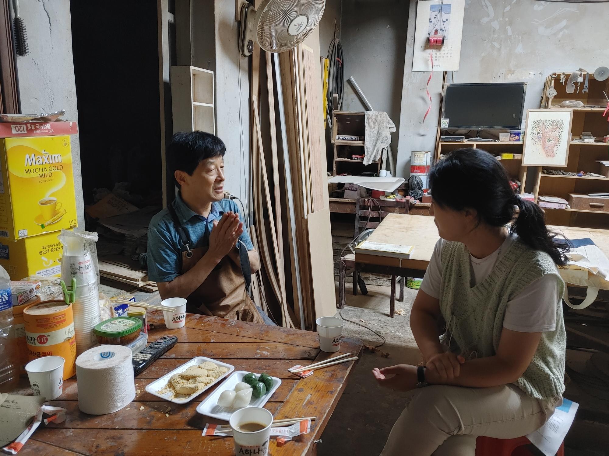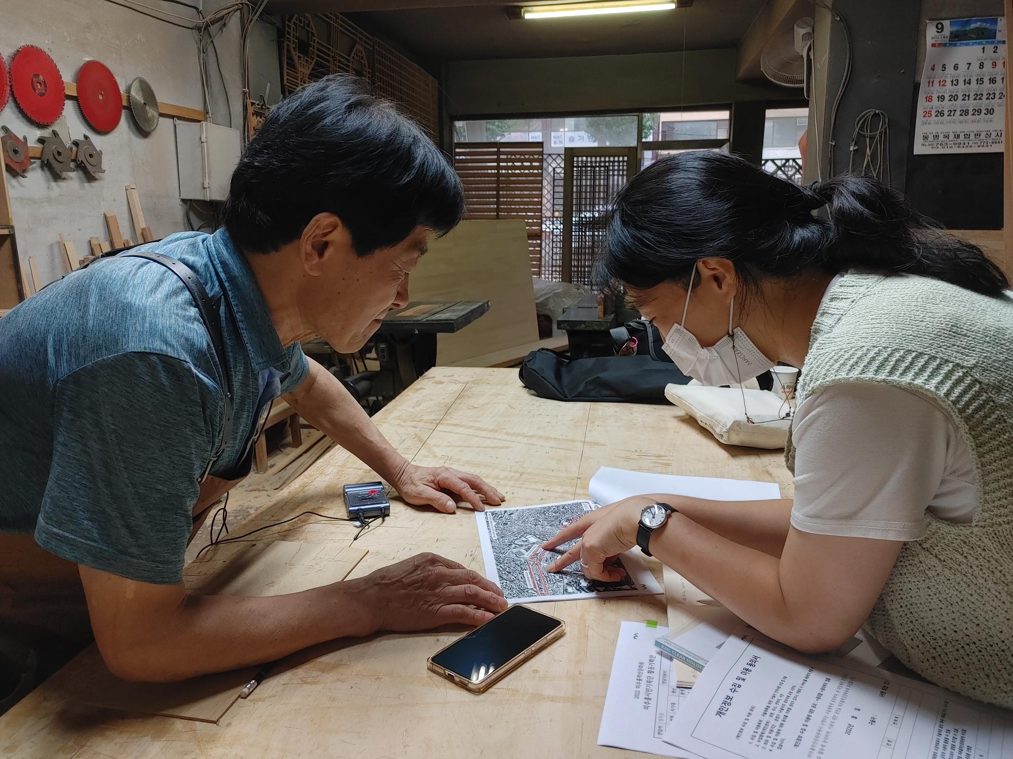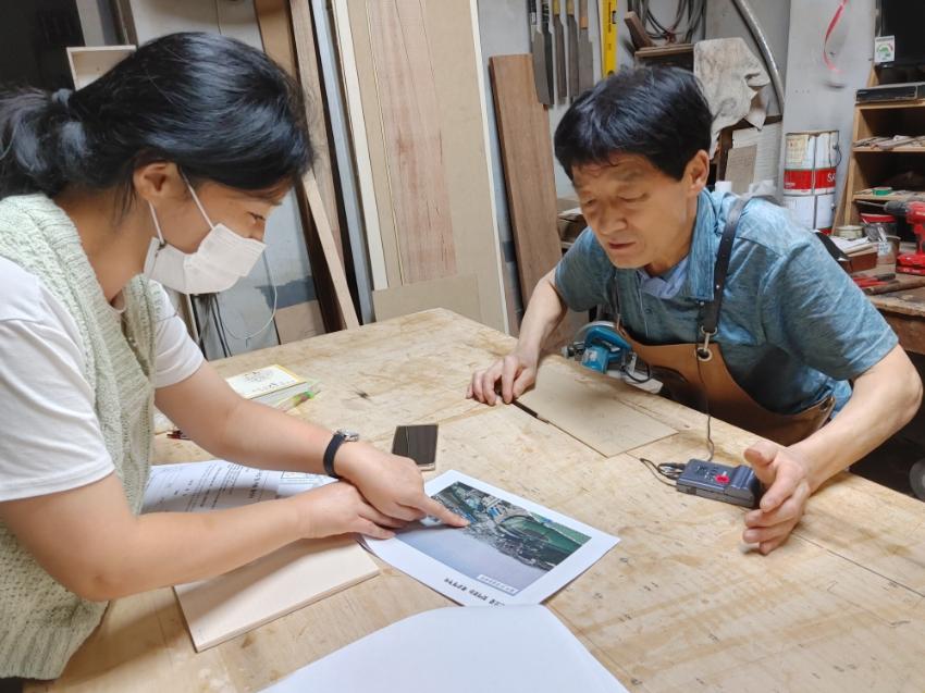 | 변경후 내용 | 2022년 숭의목공예마을 기록을 위해 미추홀시민기록단 정지선이 고려목공소 차기대 사장을 인터뷰하는 모습이다. 목공 직업을 주제로 구술자의 삶을 함께 기록하였다. • 촬영장소 : 고려목공소(미추홀구 숭의동) |