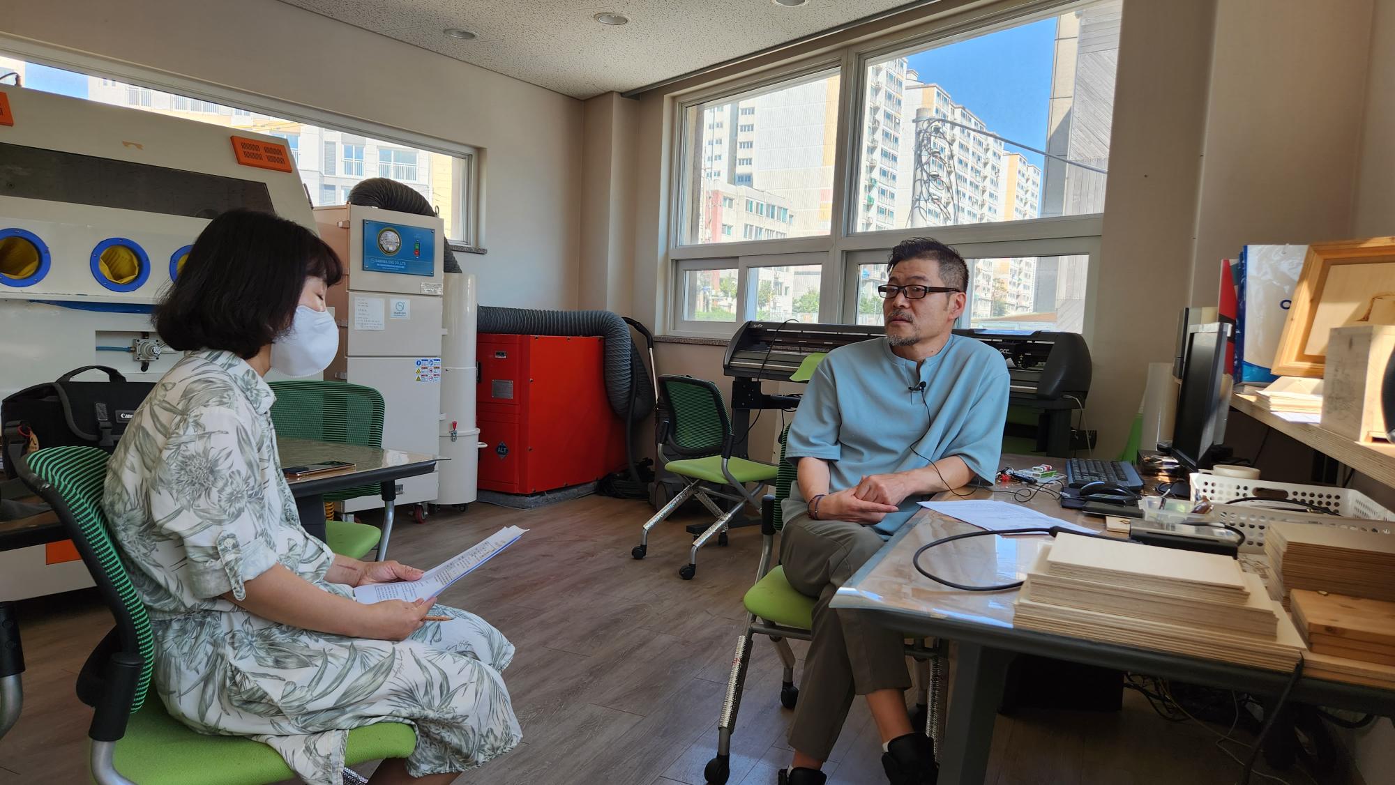 2022년 숭의목공예마을 기록을 위해 미추홀시민기록단 허은영이 준아트 이현준 사장을 인터뷰하는 모습이다. 직업을 주제로 구술자의 삶을 함께 기록하였다.