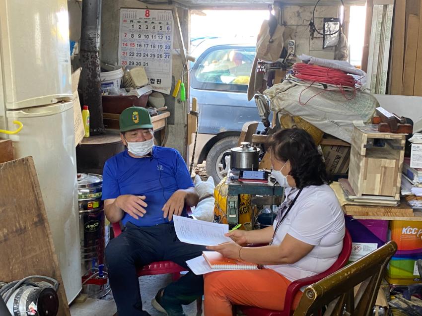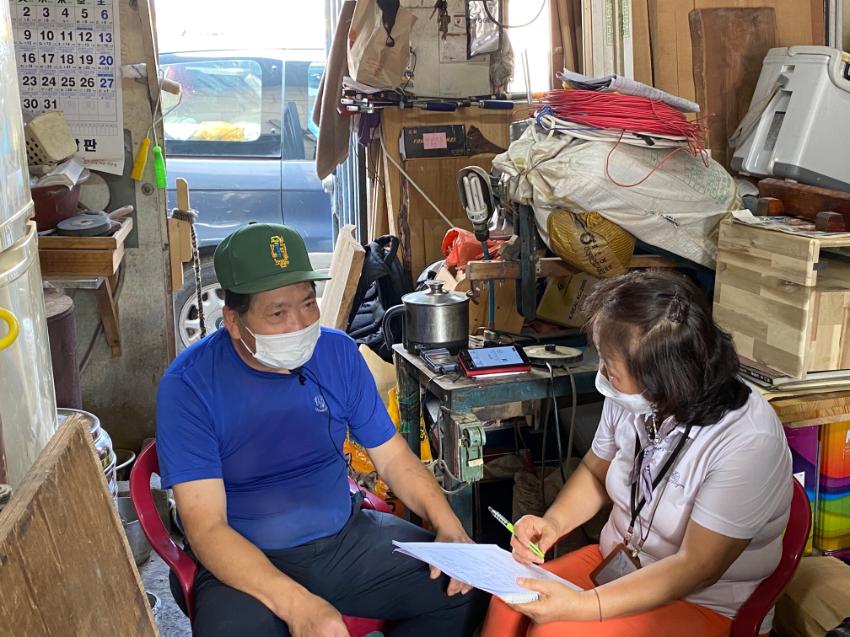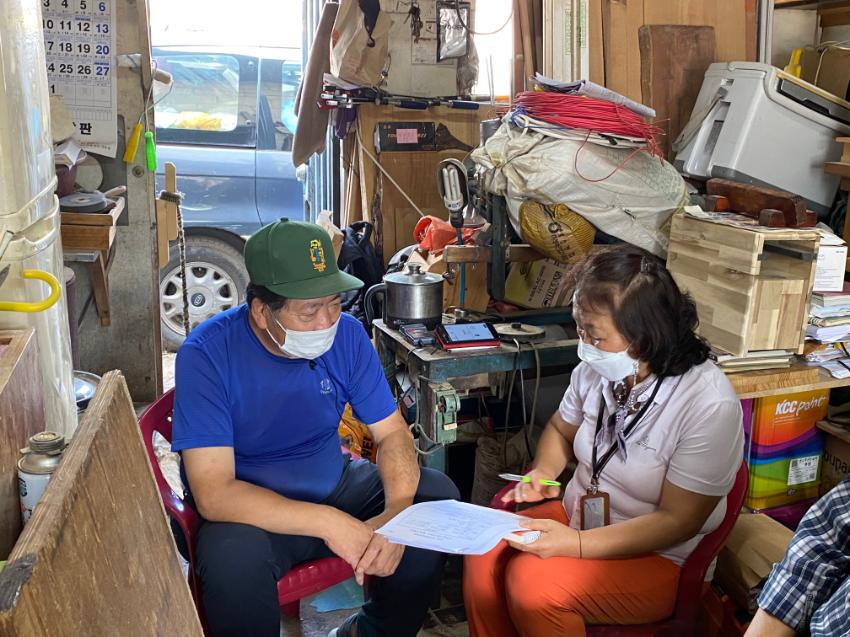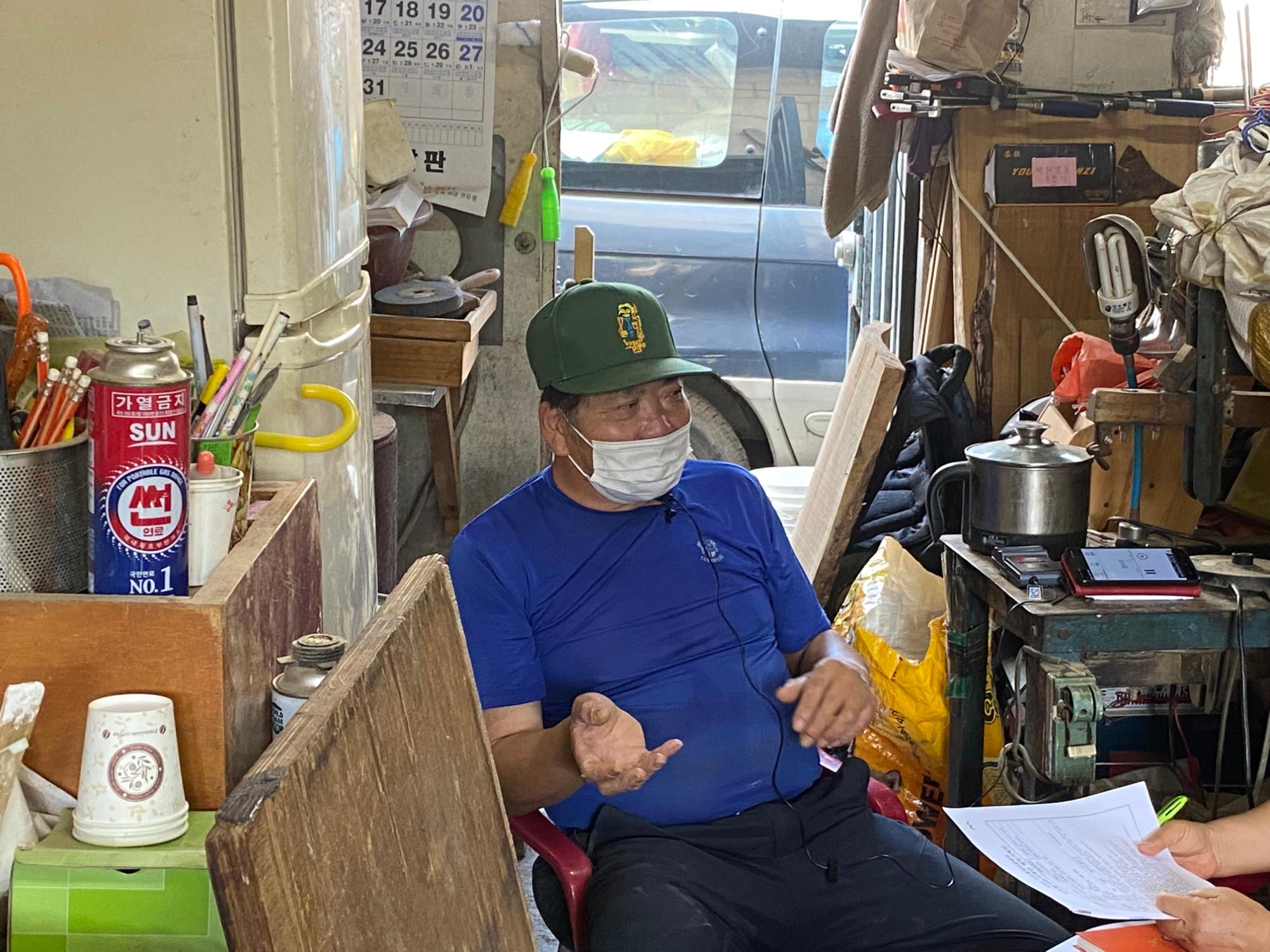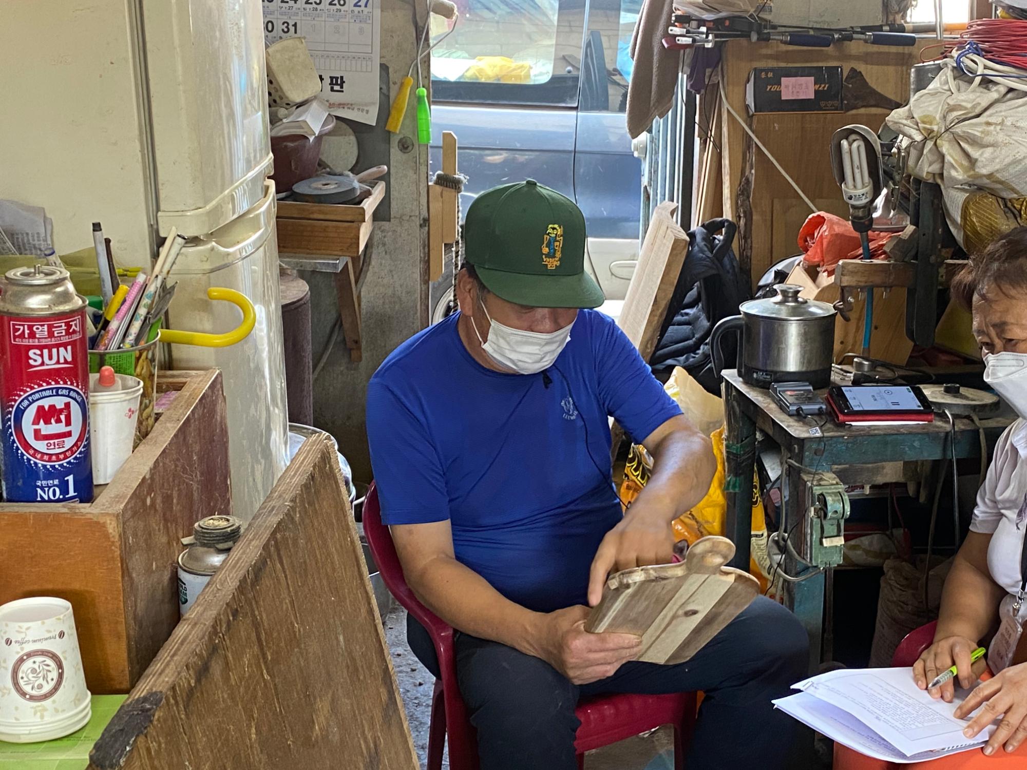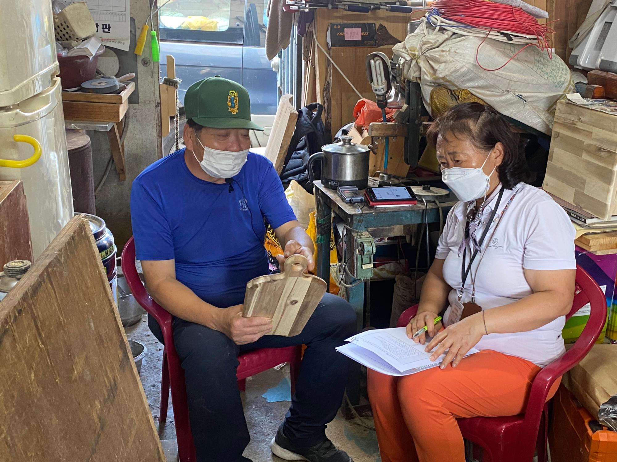 2022년 숭의목공예마을 기록을 위해 미추홀시민기록단 김순옥이 성원인테리어 이길학 사장을 인터뷰하는 모습이다. 목공 직업을 주제로 구술자의 삶을 함께 기록하였다.