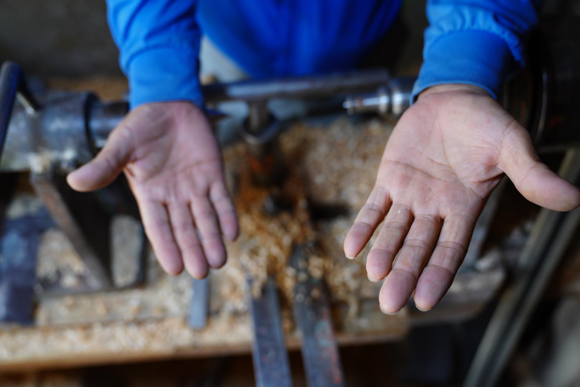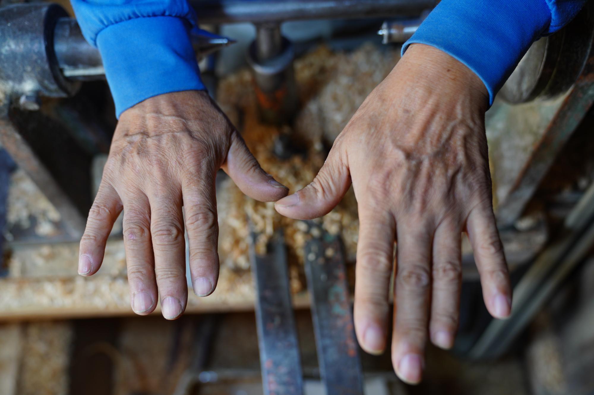 2022년 숭의목공예마을 기록을 위해 대우공예 원철성 사장의 손을 촬영한 사진이다.