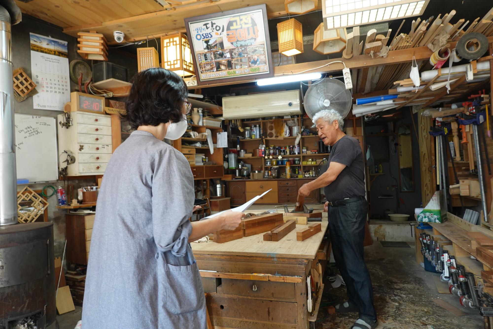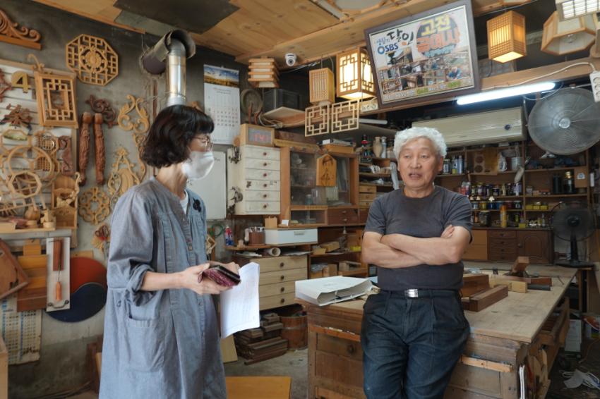 2022년 숭의목공예마을 기록을 위해 미추홀시민기록단 표기자가 고전공예사 강오원 사장을 인터뷰하는 모습이다. 목공 직업을 주제로 구술자의 삶을 함께 기록하였다.
