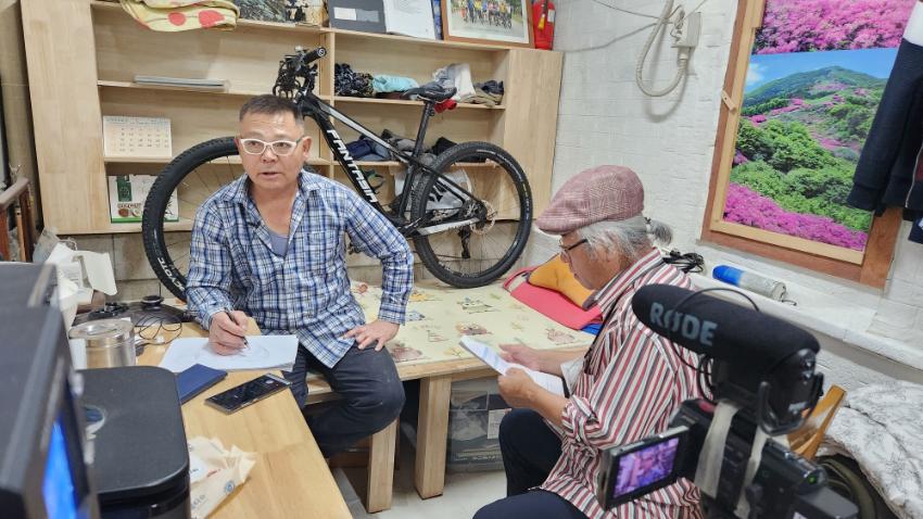 2022년 숭의목공예마을 기록을 위해 미추홀시민기록단 김용경님이 한일 사장님을 인터뷰하는 모습이다. 목공 직업을 주제로 사장님의 삶을 함께 기록하였다.