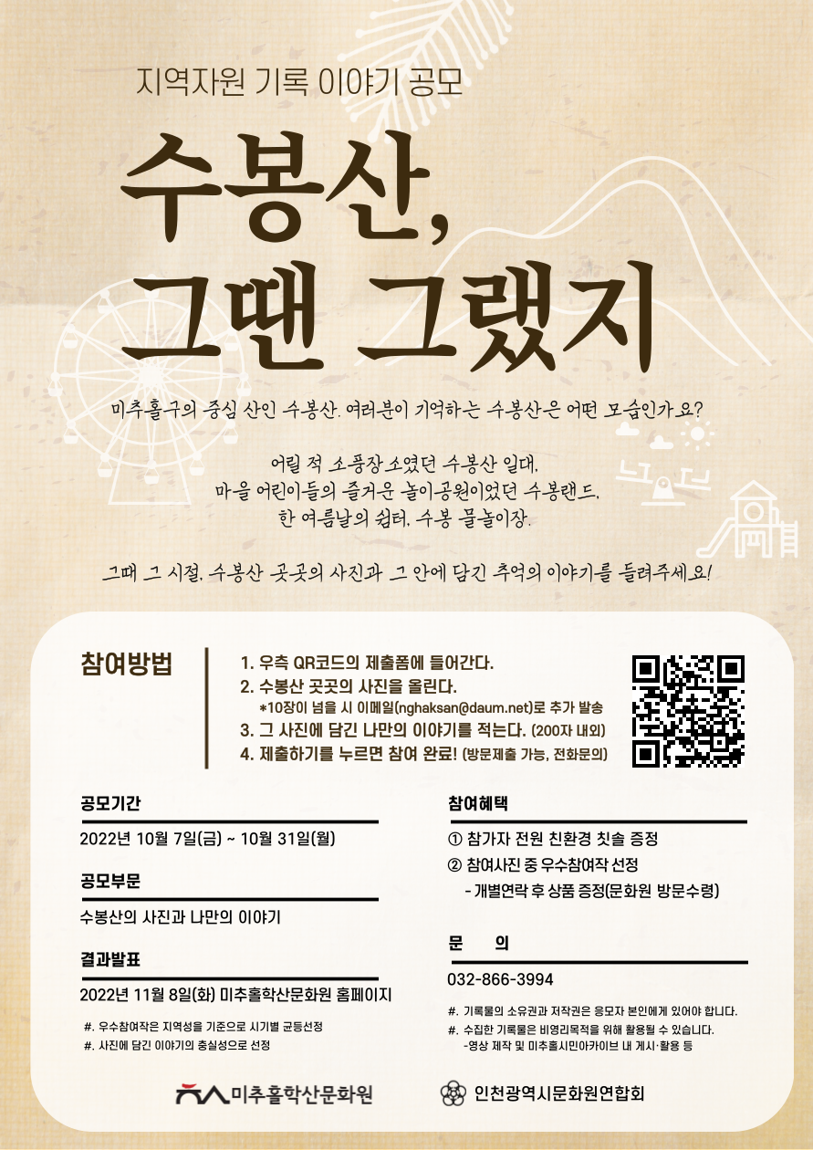 미추홀학산문화원은 2022 특성화사업 기록물 수집 공모전의 일환으로 수봉산의 오래된 사진과 이야기를 수집하기 위해 홍보이미지를 제작하여 게재하였다.