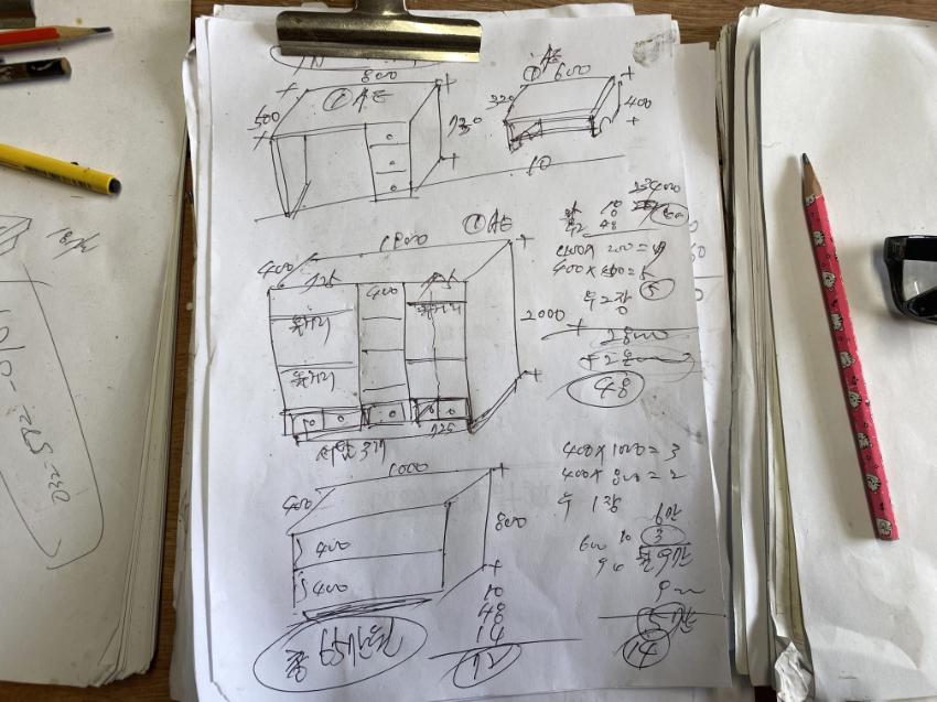 2022년 숭의목공예마을 기록을 위해 성원인테리어에 방문하였을 때 촬영한 작업노트 사진이다.