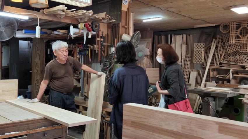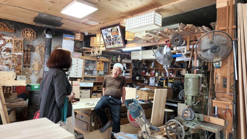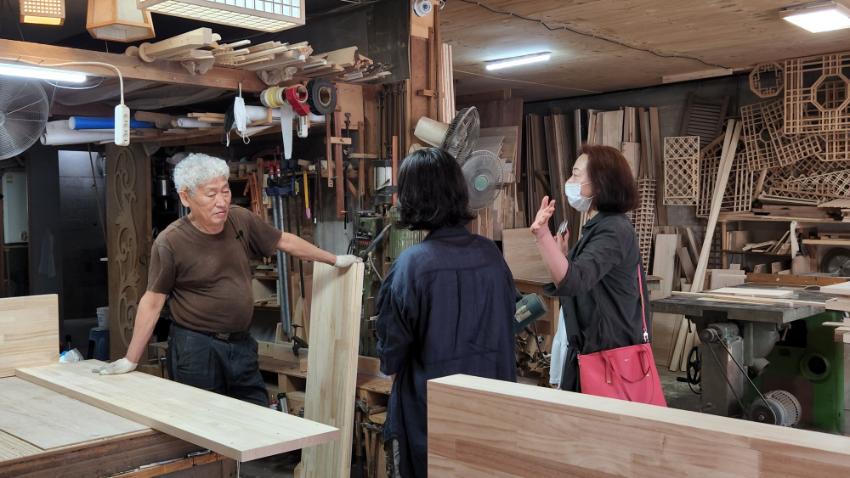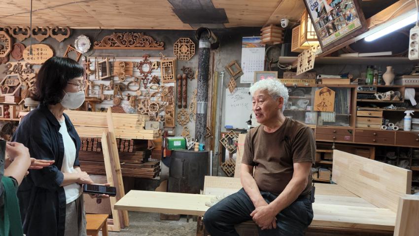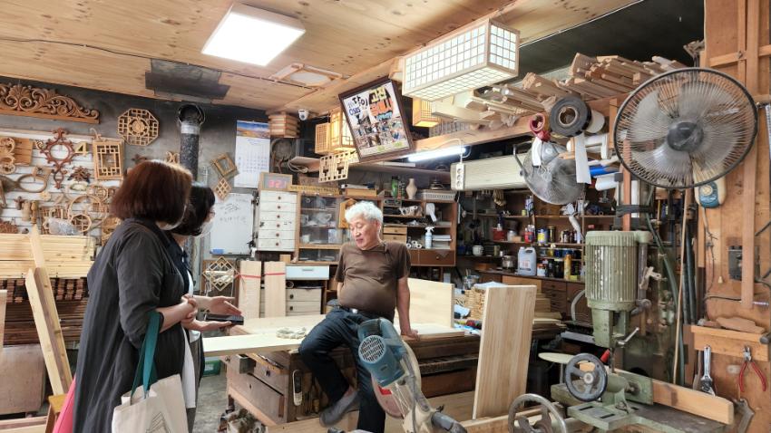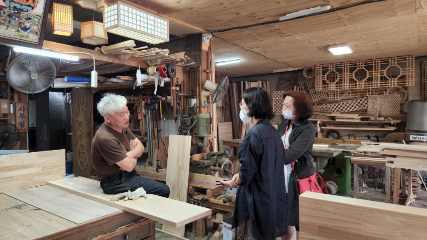 2022년 숭의목공예마을 기록을 위해 미추홀시민기록단 표기자님이 고전공예사 사장님을 인터뷰하는 모습이다. 목공 직업을 주제로 사장님의 삶을 함께 기록하였다.