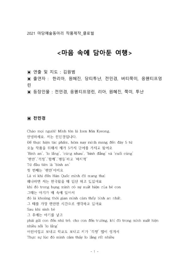 | 작품소개 | 우리 그리고 나의 이야기를 간략하고 명확한 텍스트, 이미지와 결합해서 일상 속 자유로운 움직임과 오브제로 표현하여, 결혼이주여성들의 마음 속 이야기를 진솔하게 담은 영상 |