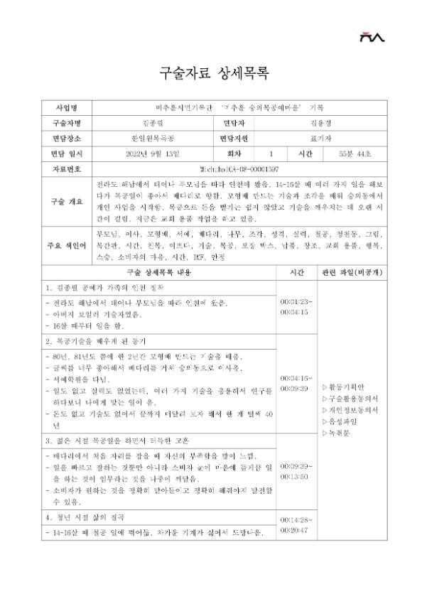 • 목    적 : 지역의 특색이 살아있는 숭의목공예마을에서 목공예의 일을 오랫동안 해 온 장인들의 구술로, 목공예의 변화상과 지역의 다양한 이야기들을 기록하고자 함.