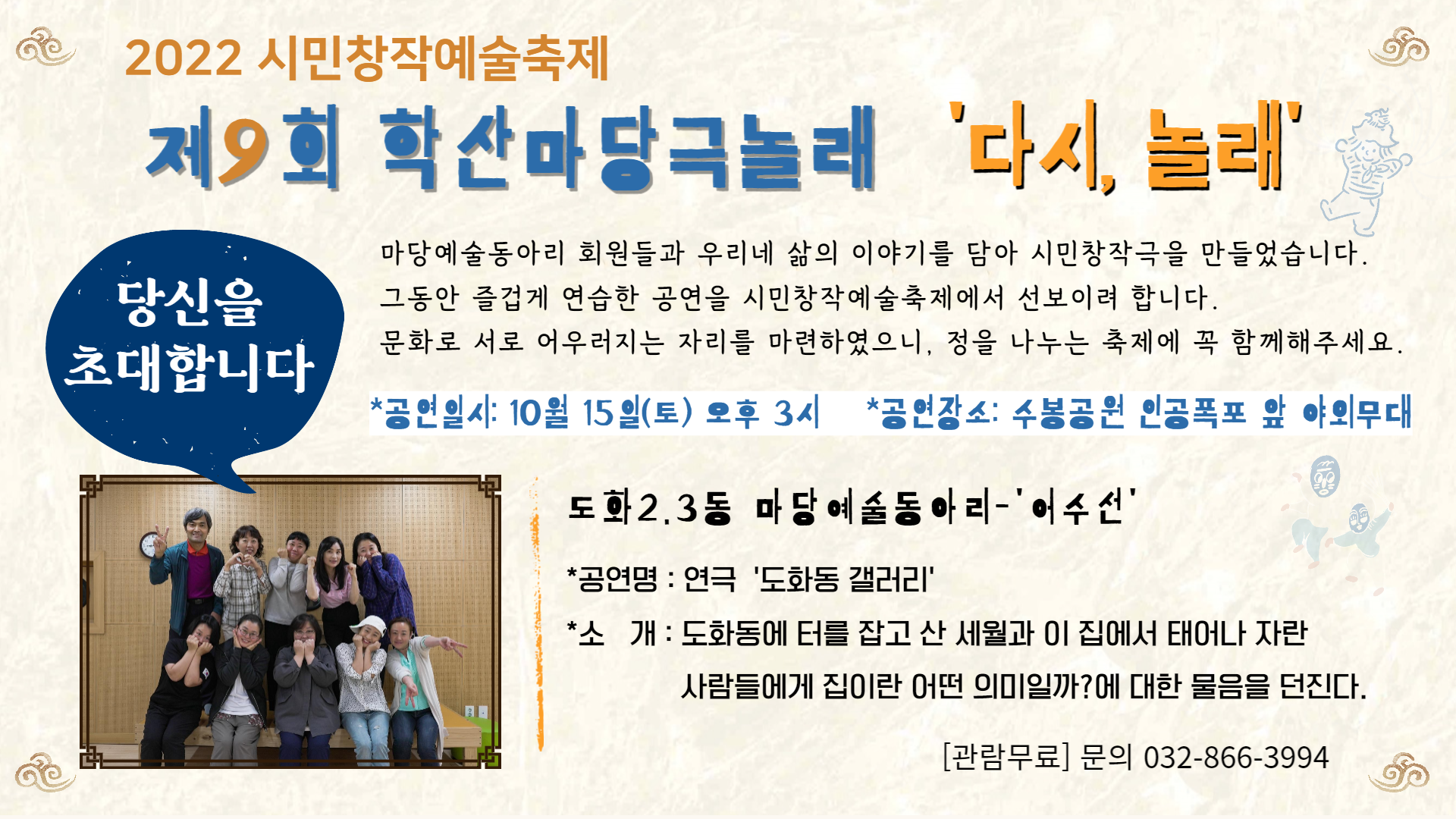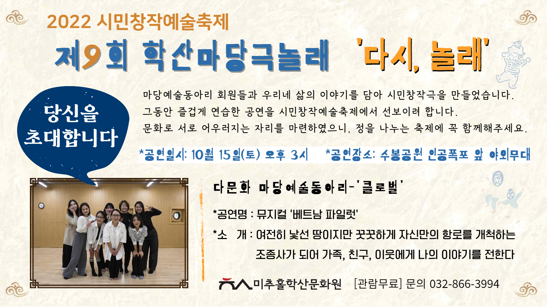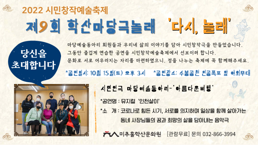 | 검색어 | 미추홀학산문화원,시민창작예술,마당예술동아리,초대장,학산마당극놀래,축제,공연,동아리,홍보 |