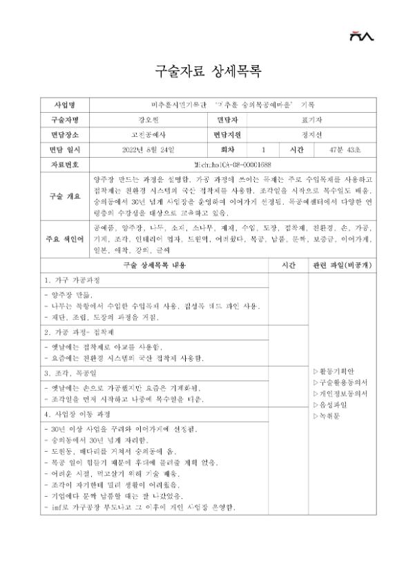 | 출처분류 | 미추홀학산문화원 사업 미추홀 기록 2022 시민기록단_목공장인 기록 인터뷰 고전공예사 |