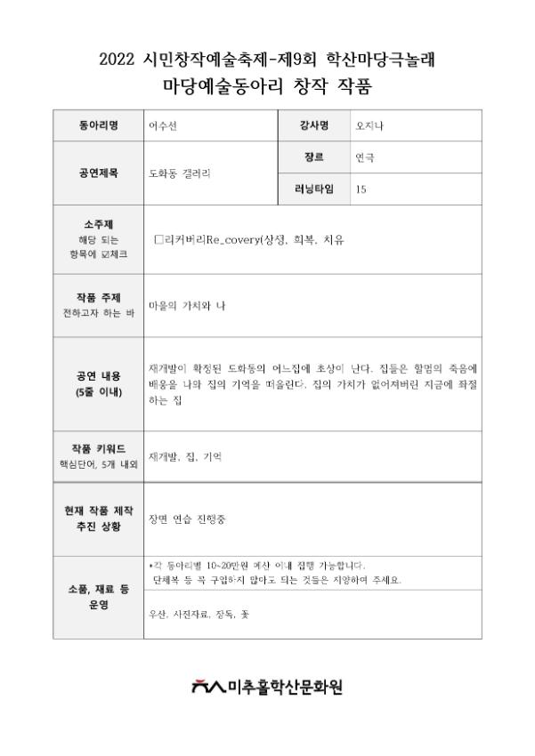 | 검색어 | 미추홀학산문화원,시민창작예술,마당예술동아리,어수선,마당예술강사,강사회의,학산마당극놀래 |