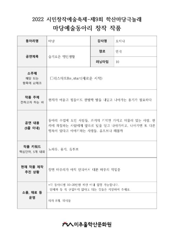 | 검색어 | 미추홀학산문화원,시민창작예술,마당예술동아리,마냥,학산마당극놀래,축제,공연,마당예술강사,강사회의 |