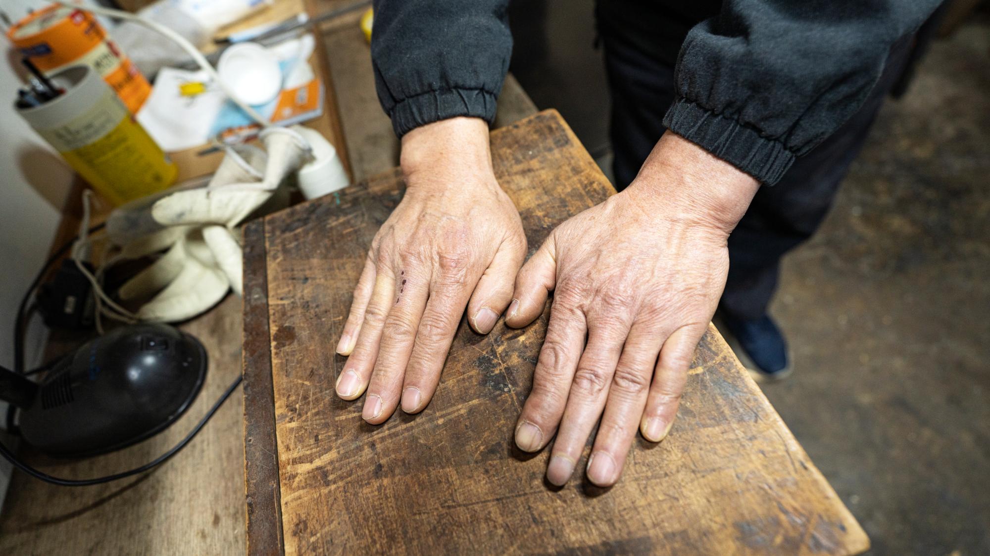 2022년 숭의목공예마을 기록을 위해 인일조각 박호만 사장의 손을 촬영한 사진이다.