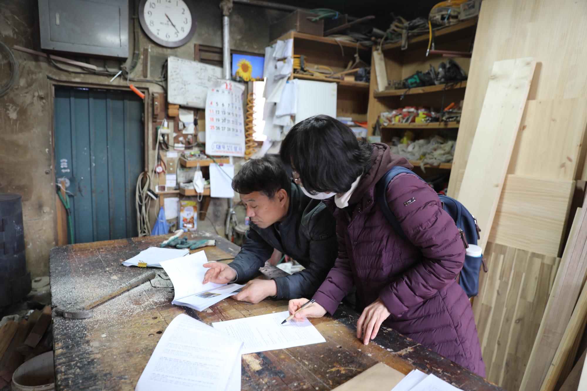 2022년 숭의목공예마을 기록을 위해 보령목공 이복섭 사장을 시민기록단 표기자가 구술 인터뷰를 하고 해당 내용에 대한 검수를 받고 있는 모습이다.