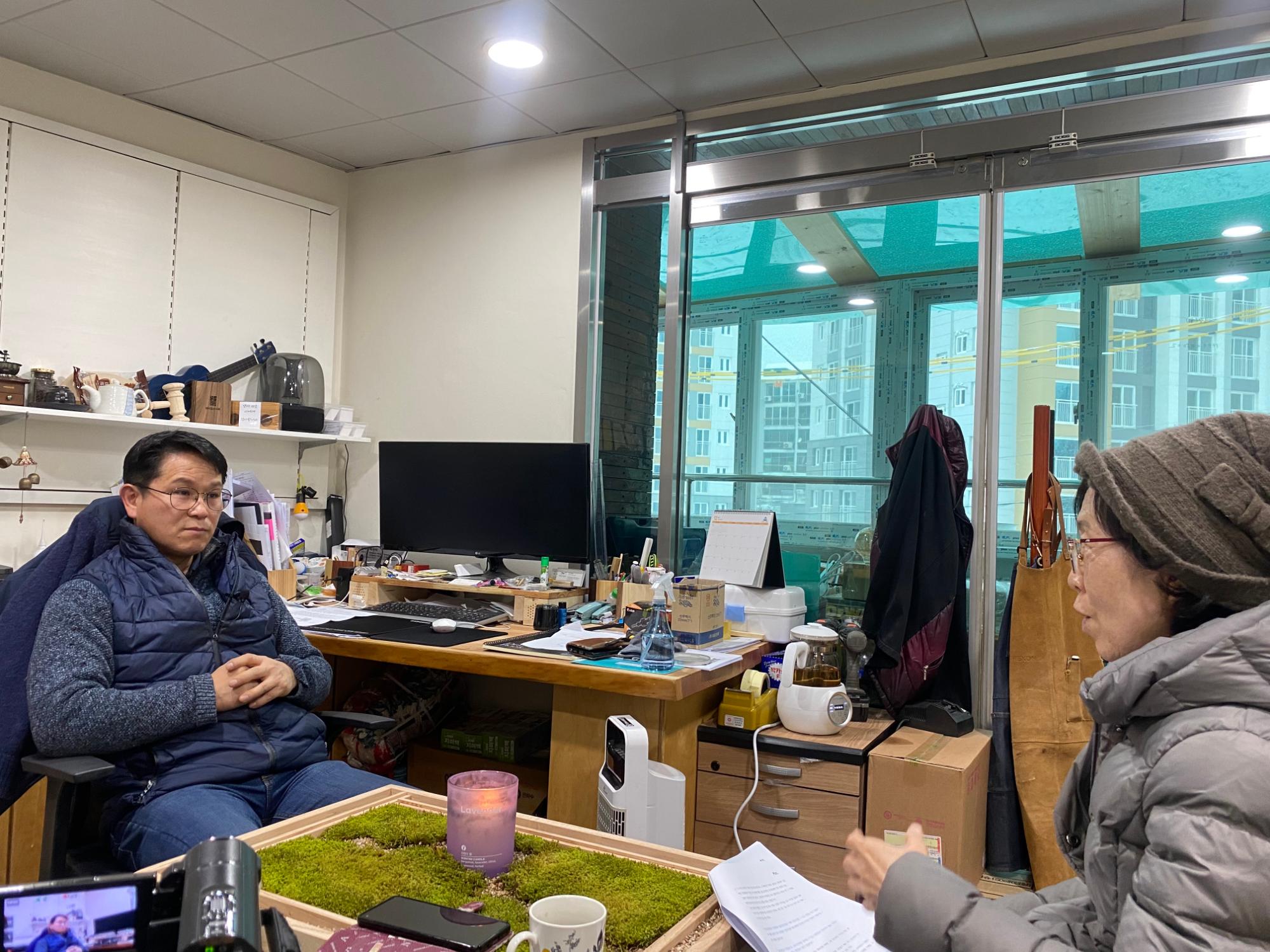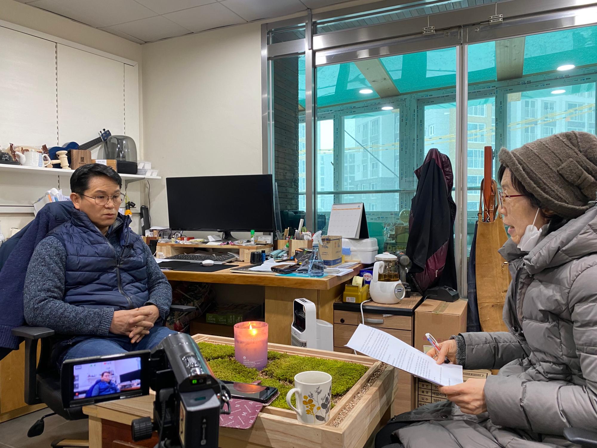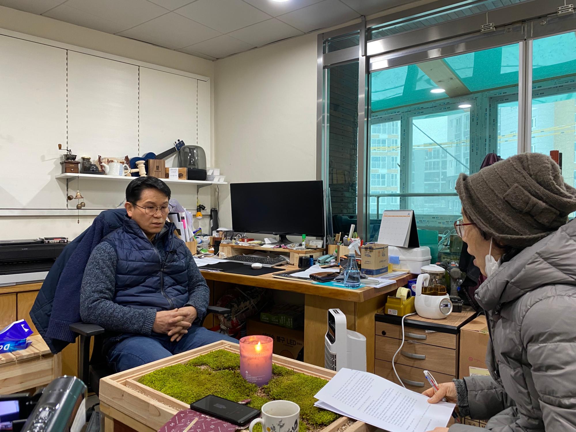 2022년 숭의목공예마을 기록을 위해 미추홀시민기록단 표기자가 숭의목공예센터 박승화 센터장을 인터뷰하는 모습이다.