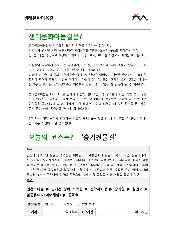 미추홀시민로드-생태문화이음길 8차시 승기천물길의 강의자료이다. 제작되어 참여자들에게 배포되었으며, 생태문화이음길에 대한 소개와 코스에 따른 사진들이 첨부되어있다.