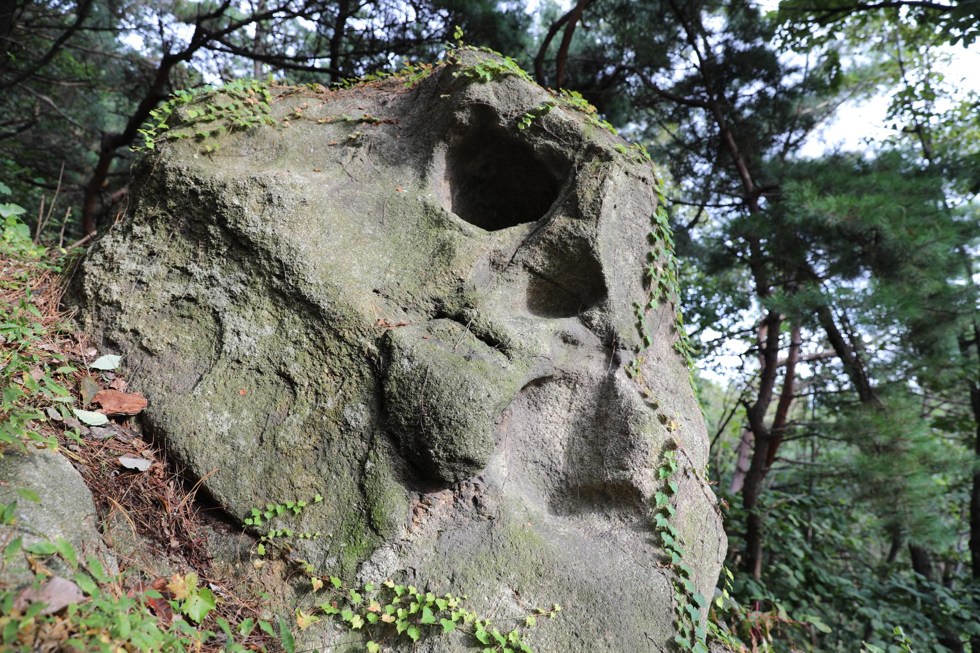 인천광역시 미추홀구 문학동에 위치한 문학산의 중바위를 촬영한 사진이다. 삼호현고개를 넘어 청학동쪽으로 15m 가량 내려가면 있는 왼쪽 벼랑의 큰 바위를 말한다. 이 바위에는 움푹파인 두 무릎 자국과 두 손자국 외에 머리가 들어갈 만한 구멍이 있어 전설들이 전해진다.