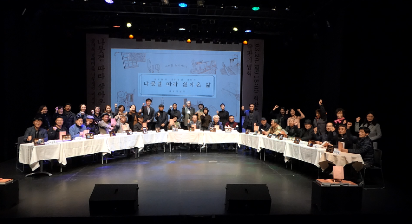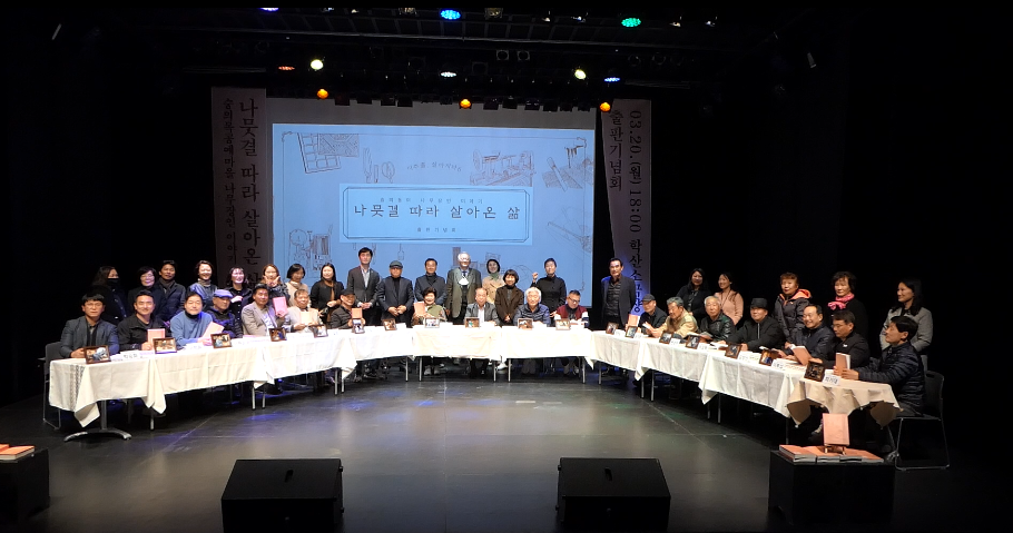 | 변경후 내용 | 숭의목공예마을 나무장인 이야기 '나뭇결 따라 살아온 삶' 도서 출판기념회의 단체사진이다. • 촬영장소: 학산소극장 • 촬영일자: 2023년 3월 20일 |