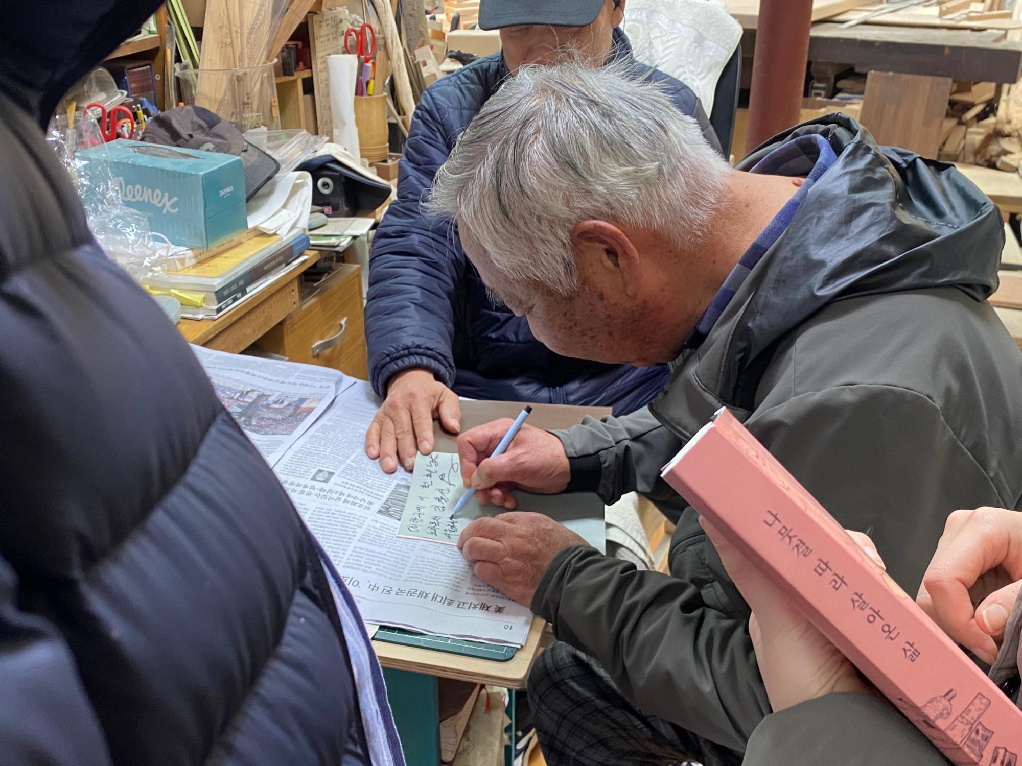 숭의목공예마을 나무장인이야기 '나뭇결 따라 살아온 삶' 도서에 서울목공예 변경인 장인이 서명하는 모습을 촬영한 사진이다.