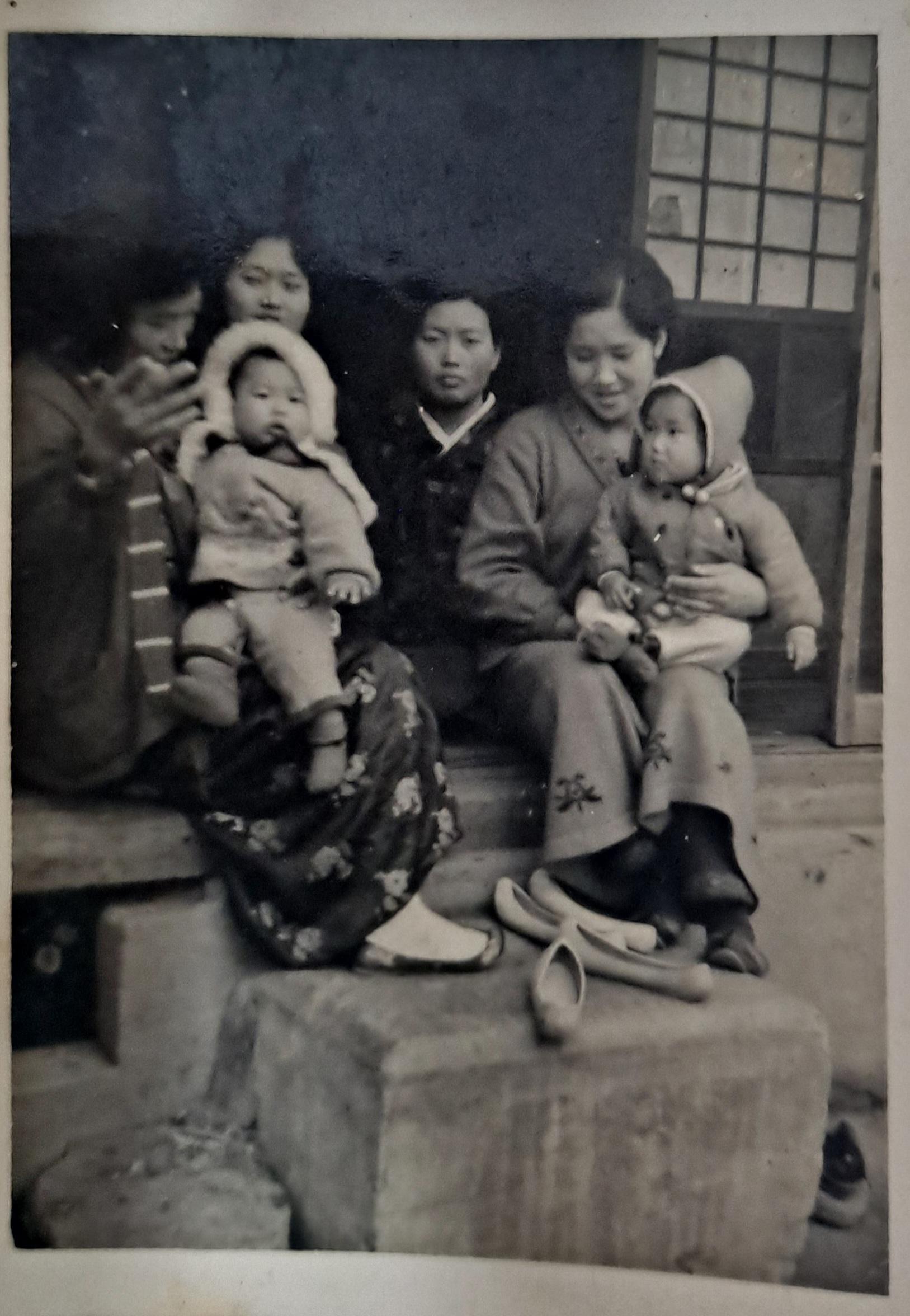 엄마가 집에 놀러온 이모와 함께 이웃에 사는 애기 엄마들과 즐거운 시간을 보내고 있다.