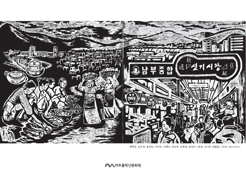 메인 이미지는 2018년 신기시장과 그 주변에서 살아가고 있는 사람들의 이야기를 이미지화하여 판에 새긴 판화 작품이다.