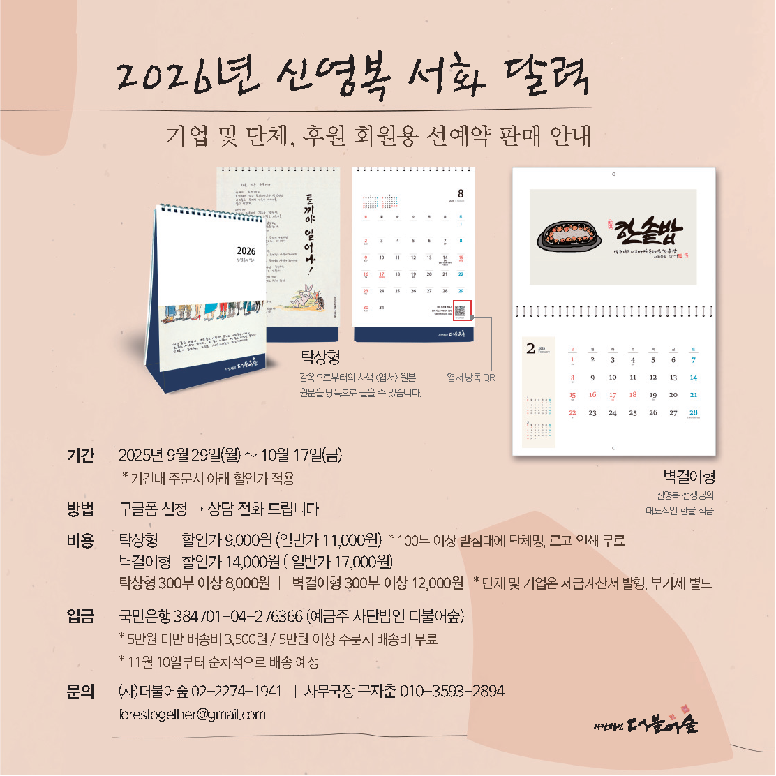 (사)더불어숲 사무국 입니다. 2026년도는 故신영복 선생님께서 돌아가신 지 10주기가 되는 해입니다. 탁상형 달력은 기존의 서화 대신 엽서 원본으로 12개월을 구성하였으며, 매월 페이지에 있는 큐알코드로 엽서의 원문을 아름다운 목소리로 낭송을 들을 수 있도록 준비하고 있습니다. 벽걸이형 달력은 선생님의 대표적인 한글 서예작품으로 구성하였습니다. 기업 및 단체에 <2026년 신영복 서화달력>판매 안내를 드립니다. ★선예약판매 접수 기간: 2025년 9월 29일 (월) ~ 2025년 10월 17일 (금) ★탁상형: 할인가 9,000원(일반가 11,000원) ★벽걸이형: 할인가 14,000원 (일반가 17,000원) *부가세 별도 ★300부이상 : 8,000원(탁상형), 12,000원(벽걸이형) ★회사명과 로고 : 100부 이상 주문시 무료로 진행. ★입금 계좌: 국민은행384701-04-276366(예금주: 사단법인 더불어숲) ★5만원미만 배송비 3,500원 / 5만원이상 주문시 배송비 무료 ★달력의 배송은 11월 10일부터 진행할 예정입니다. ★구글폼신청서 후원회원 https://forms.gle/WkkgUL3d9cU3FnW77 단체 https://forms.gle/WkkgUL3d9cU3FnW77