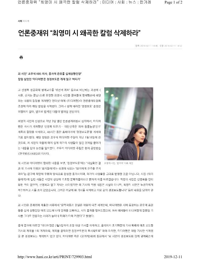 최 시인“ 조우석 KBS 이사, 풍자적 은유를 실제상황인양” 칼럼 실었던 ‘미디어펜’은 정정보도문 게재 않고 ‘버티기’ 고 신영복 성공회대 명예교수를 ‘위선적 좌파’ 등으로 비난하는 과정에 <서른, 잔치는 끝났다>로 유명한 최영미 시인을 끌여들여 명예훼손에 해당하는 내용의 칼럼을 게재했던 인터넷 매체 <미디어펜>이 언론중재위원회 조정에 따라 해당 칼럼을 삭제했다. 그러나 함께 내려진 ‘정정보도’ 결정은 이행하지 않아, 앞으로 법적인 다툼이 벌어질 전망이다. 최영미 시인의 신청으로 지난 3일 열린 언론중재위원회 심리에서, 미디어펜은 자사가 게재했던 ‘신영복 띄우기… 대한민국은 ‘좌파 동물농장’인가’ 제목의 칼럼을 삭제하고, 48시간 동안 홈페이지에 ‘정정보도문’을 게재하기로 합의했다. 해당 칼럼은 조우석 미디어펜 주필이 지난 1월18일에 쓴 것으로, 최 시인의 작품에 마치 실제 작가의 사생활이 담긴 것처럼 몰아가는 내용을 담아 논란을 일으켰다. 조우석 미디어펜 주필은 현재 공영방송 <한국방송>(KBS)의 이사다. 최 시인과 미디어펜이 합의한 내용을 보면, ‘정정보도문’에는 “사실확인 결과 위 기사에 인용된 ‘돼지들에게’는 성경에 나오는 “돼지에게 진주를 주지 마라”는 문구에 착안해 우화적 방식으로 완성한 풍자시이며, 작가의 사생활을 그대로 반영한 것은 아닙니다. 시집 <돼지들에게>에 실린 시들은 시인의 상상에 기초한 문학작품이라고 밝혀져 이를 바로잡습니다. 최영미 시인은 신영복을 인터뷰한 적이 없으며, 신영복과 알고 지내는 사이였지만 위 기사에 적힌 내용은 사실이 아니며, 최영미 시인은 누군가에게 복수하려고 시를 쓰지 않았습니다. 그러한 까닭에 원 기사를 삭제하고 이와 같이 정정보도합니다” 등의 내용을 담아야 한다. 최 시인은 중재위에 제출한 서류에서 “문학작품과 현실은 차원이 다른 세계인데, 미디어펜은 시에 등장하는 은유적 표현들을 실제 상황인양 왜곡 보도해 나의 인격을 모욕하고, 시의 품격을 떨어뜨렸으며, 여러 매체들이 미디어펜의 잘못된 기사를 그대로 인용하는 사례가 늘어나 피해가 더욱 커졌다”고 밝혔다. 중재 결과에 따르면 “미디어펜은 2월5일까지 조정 대상 기사를 삭제하고, 홈페이지 초기화면의 기사 목록에 애초 보도한 기사의 제목을 1회 게재하되, 제목을 클릭하면 정정보도문이 표시되도록” 해야 하지만, 미디어펜은 해당 기사만 삭제했을 뿐 정정보도는 게재하지 않고 있다. 미디어펜 쪽은 <한겨레>와의 통화에서 “최 시인이 정정보도와 함께 명예훼손에 대한 손해배상도 청구했는데, 손해배상에 대한 합의가 원활하지 않다. 향후 손해배상에 대한 합의가 어떻게 진행되는지 지켜보며 정정보도 여부를 결정할 생각”이라고 입장을 밝혔다. 이에 대해 최 시인은 “손해배상과 무관하게 이미 언론중재위에서 정정보도 결정을 내렸는데, 미디어펜은 이조차 이행하지 않았다”며 “합의사항을 이행하지 않은 데 대해 곧 법원에 강제집행을 신청할 예정”이라고 말했다. 또 손해배상 건에 대해서도 “언론중재위에서 조정이 제대로 이뤄지지 않으면 법정에 가더라도 필자인 조우석 미디어펜 주필에게 분명한 책임을 묻겠다”고 밝혔다. 한겨레