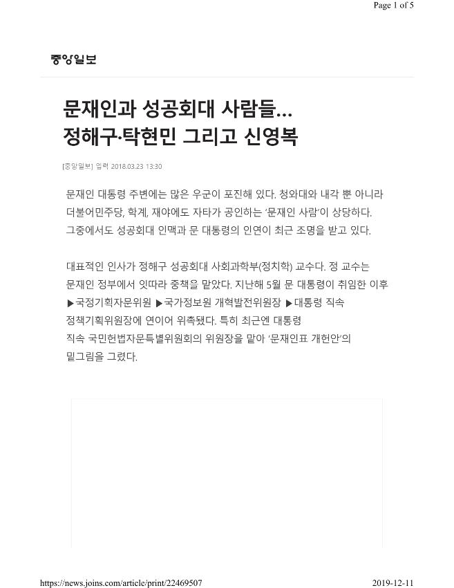 문재인 대통령 주변에는 많은 우군이 포진해 있다. 청와대와 내각 뿐 아니라 더불어민주당, 학계, 재야에도 자타가 공인하는 ‘문재인 사람’이 상당하다. 그중에서도 성공회대 인맥과 문 대통령의 인연이 최근 조명을 받고 있다. 대표적인 인사가 정해구 성공회대 사회과학부(정치학) 교수다. 정 교수는 문재인 정부에서 잇따라 중책을 맡았다. 지난해 5월 문 대통령이 취임한 이후 ▶국정기획자문위원 ▶국가정보원 개혁발전위원장 ▶대통령 직속 정책기획위원장에 연이어 위촉됐다. 특히 최근엔 대통령 직속 국민헌법자문특별위원회의 위원장을 맡아 ‘문재인표 개헌안’의 밑그림을 그렸다. 문 대통령과 정 교수를 모두 잘 아는 더불어민주당 의원 2명에게 문 대통령이 정 교수에게 전폭적인 신뢰를 보내는 이유를 물었다. 다음과 같은 대답이 돌아왔다. “그 분은 절대 자리를 탐하지 않는다. 그러니 무슨 일을 해도 다른 사람들이 시기하기 어렵다. 그리고 한 번도 우리 진영을 벗어나 다른 데를 기웃거리지 않았다. 일을 적당히 해도 될 것 같은데 밤을 새서라도 일한다. 우리에게는 재산이다, 재산.”(수도권 재선 의원) “오랜 동지다. 사실 폴리페서 아니냐. 그런데 반질반질해 보이지 않는다. 원칙도 확고하다. 문 대통령이 그런 사람을 좋아하는 것 같다.”(충청권 재선 의원) 진보 정치학자인 정 교수는 현 여권의 정치개혁 논의가 있을 때면 늘 한가운데 있었다. 2002년 대선 때 노무현 전 대통령의 당선을 도왔던 그는 노무현 정부의 정책기획위원이었고, 2008년 통합민주당 공천심사위원, 2012년 대선 당시 문재인 민주통합당 후보의 새정치위원회 간사, 2013년 민주통합당 정치혁신위원장을 지냈다. 성공회대 인맥에서 빼놓을 수 없는 사람이 탁현민 청와대 의전비서관실 선임행정관이다. 공연기획자 출신인 그는 딱딱하고 건조할 수 있는 대통령의 일정에 감성을 불어넣는 인사로 통한다. 활동반경도 의전비서관실 본연의 업무를 훌쩍 뛰어넘는다. 탁 행정관은 22일부터 사흘 일정으로 평양을 방문했다. 남북 정상회담을 앞두고 북한에서 열리는 한국 예술단의 공연을 준비하기 위해서다. 성공회대를 졸업한 그는 다음기획 등에서 일하며 공연기획 전문가가 됐고, 성공회대 신문방송학과 겸임교수로 활동하면서 논객으로 유명세를 탔다. 가수 윤도현씨와 방송인 김제동씨가 성공회대 동문이 된 것도 탁 행정관과의 인연이 작용했다고 한다. 탁현민, 노무현 추모 공연 흥행시키며 인연 탁 행정관과 문 대통령의 인연이 시작된 건 9년 전이다. 2009년 6월 성공회대에서 열린 ‘노무현 추모 콘서트’를 탁 행정관이 기획했고, 이를 눈여겨본 양정철 전 청와대 홍보기획비서관이 그에게 노무현재단 창립 기념공연 등의 기획을 맡겼다. 행사가 흥행에 성공하자 문 대통령 역시 그를 마음에 두기 시작했다고 한다. 문 대통령과 특히 가까워진 계기는 2016년 6월 히말라야 트레킹 때였다. 탁 행정관은 양정철 전 비서관과 함께 거의 한 달 동안 문 대통령 곁을 24시간 지켰다. 정해구 교수가 '문재인 정치'의 알맹이(정책)를 채우고, 탁현민 행정관이 그걸 포장(홍보)하는 역할을 한다면 문 대통령에게 영감을 불어넣어준 이는 고(故) 신영복 성공회대 석좌교수란 평가가 나온다. 신 교수는 문 대통령이 취임 이후 공개 연설에서 “존경한다”고 표현한 몇 안 되는 사람이다. 문 대통령은 지난달 9일 평창 겨울올림픽 개회식 직전 열린 리셉션 행사에서 “제가 존경하는 한국의 사상가 신영복 선생은 겨울철 옆 사람의 체온으로 추위를 이겨나가는 것을 정겹게 일컬어 ‘원시적 우정’이라 했다”며 “세계 각지에서 모인 우리들의 우정이 강원도의 추위 속에서 더욱 굳건해지리라 믿는다”고 말했다. 통일혁명당 사건으로 20년간 옥살이를 한 신 교수가 쓴『감옥으로부터의 사색』을 인용한 것이다. 당시 청와대를 방문한 김여정 북한 노동당 중앙위원회 제1부부장과 문 대통령이 기념 사진을 촬영한 배경판도 신 교수의 서화 ‘通(통)’과 이철수 판화가의 한반도 작품이었다. 문 대통령은 지난해 1월 신 교수 1주기 추도식 때는 “선생님 뜻대로 많은 촛불들과 함께 더불어 정권 교체하고 세상을 꼭 바꾸겠다”고 다짐한 적도 있다. 중앙일보