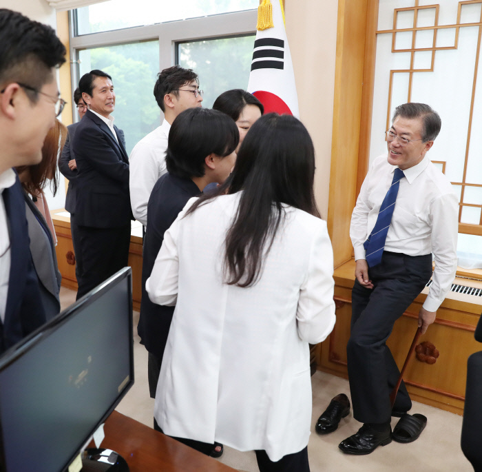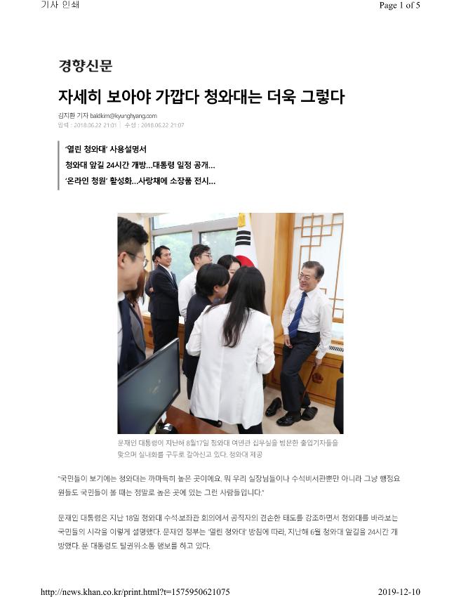 ‘열린 청와대’ 사용설명서 ㆍ청와대 앞길 24시간 개방…대통령 일정 공개… ㆍ‘온라인 청원’ 활성화…사랑채에 소장품 전시… 문재인 대통령이 지난해 8월17일 청와대 여민관 집무실을 방문한 출입기자들을 맞으며 실내화를 구두로 갈아신고 있다. 청와대 제공 “국민들이 보기에는 청와대는 까마득히 높은 곳이에요. 뭐 우리 실장님들이나 수석비서관뿐만 아니라 그냥 행정요원들도 국민들이 볼 때는 정말로 높은 곳에 있는 그런 사람들입니다.” 문재인 대통령은 지난 18일 청와대 수석·보좌관 회의에서 공직자의 겸손한 태도를 강조하면서 청와대를 바라보는 국민들의 시각을 이렇게 설명했다. 문재인 정부는 ‘열린 청와대’ 방침에 따라, 지난해 6월 청와대 앞길을 24시간 개방했다. 문 대통령도 탈권위·소통 행보를 하고 있다. 그럼에도 청와대는 여전히 국민들에게 ‘높은 곳’이다. 더 가까이 들여다보고, 관심을 가져야 청와대와 국민의 거리를 좁힐 수 있다. 청와대 홈페이지 ‘대통령 공개일정’ 코너. 날짜를 클릭하면 시간, 장소, 일정명, 참석자 등의 정보를 확인할 수 있다. 청와대 홈페이지 캡처 ■ 대통령의 24시간 문 대통령은 대선 기간 중 “대통령의 일과를 국민에게 투명하게 보고하겠다”는 공약을 제시했다. 세월호 참사 당일 박근혜 전 대통령의 ‘7시간’에 대한 국민적 의혹이 컸던 만큼 이를 반면교사 삼아 ‘열린 대통령’이 되겠다는 취지에서였다. 청와대는 공약 이행을 위해 지난해 10월부터 공무와 관련된 문 대통령의 비공개 일정을 매주 월요일 청와대 홈페이지에 사후 공개하고 있다. 국민들이 확인할 수 있는 정보는 시간, 장소, 일정명, 참석자 등 네 가지다. 다만 청와대 내부 보고의 경우 보고 주체를 비서실, 국가안보실, 정책실 등으로만 적어 놓고 있어 구체적으로 누가 어떤 보고를 했는지 확인할 순 없다. 공무와 무관한 문 대통령 일정도 공개되지 않는다. 청와대 직원들의 일상은 이른 새벽부터 시작된다. 청와대가 지난달 문 대통령 취임 1주년을 맞아 공개한 영상 ‘청와대의 아침 365번, 그리고 다시 처음’을 보면 새벽 5시부터 연풍문 앞에 택시를 타고 도착하는 직원들의 모습이 보인다. 한 비서관은 “비용이 들긴 하지만 조금이라도 눈을 더 붙이려고 택시를 타고 출근한다”고 말했다. 새벽같이 출근한 직원들은 조간신문 등을 확인한 뒤 수석실별로 회의를 갖는다. 수석비서관과 비서관들은 수석실별 회의 결과를 바탕으로 국정상황실에서 매일 오전 8시10분 현안점검회의를 갖는다. 현안점검회의는 임종석 대통령비서실장이 주재한다. 임 실장을 비롯한 핵심 참모와 윤영찬 국민소통수석, 김의겸 대변인 등은 현안점검회의 뒤인 오전 9시10분 문 대통령과 티타임 회의를 한다. 늦은 시각까지 보고서 등을 꼼꼼히 읽는 것으로 알려진 문 대통령의 눈은 회의 때 늘 충혈돼 있다고 한다. ‘대통령의 입’인 대변인은 대변인실, 국민소통수석실, 비서실장 주재 현안점검회의, 대통령 티타임 회의 등 매일 오전에만 4차례 회의에 참석한다. 이 때문에 김 대변인은 청와대에서 약 1㎞ 떨어진 대경빌라(대통령 경호처 빌라)에 산다. 청와대 홈페이지 국민청원 코너 안내문. 청와대는 한 달간 20만명 이상이 참여한 청원에 공식 답변을 하고 있다. 청와대 홈페이지 캡처 ■ ‘온라인 신문고’ 국민청원 문재인 정부 들어 국민들은 신문고를 두드리는 대신 키보드를 두드리며 목소리를 내고 있다. 문전성시를 이루고 있는 청와대 홈페이지 국민청원 게시판이 바로 그 목소리들이 모이는 곳이다. 국민이 올린 청원에 한 달간 20만명 이상이 참여하면 청와대는 공식 답변을 하고 있다. 청원 담당자인 정혜승 뉴미디어비서관은 “월 7~8건 정도 답변할 청원이 들어온다”고 말했다. 국민청원과 별개로 민원 신청을 위한 국민신문고(www.epeople.go.kr)도 있다. 홈페이지에서 민원 신청서를 작성하고 민원을 접수할 기관으로 청와대를 선택하면 된다. 문재인 정부 출범 1년간 접수된 민원은 총 4만8177건으로 이전 정부 1년차의 3만3179건 대비 45% 증가했다. 문재인 정부 들어 청와대 자체가 ‘미디어’화되고 있다. 매일 오전 11시50분 페이스북 라이브로 진행되는 ‘11시50분, 청와대입니다’가 대표적이다. 이 라이브 방송에선 고민정 부대변인, 정혜승 비서관 등이 출연해 청와대 소식을 전한다. 각종 현안이 있을 경우 담당 비서관이나 수석이 나와 설명을 하기도 한다. 20만명 이상이 참여한 국민청원에 대한 청와대 답변을 공개하는 통로도 이곳이다. 문재인 대통령이 지난해 7월14일 청와대 여민관 집무실 창가에서 청와대 관람을 온 시민들에게 인사하고 있다. 문 대통령 트위터 캡처 ■ 청와대 관람 청와대 관람은 인터넷 사전예약제로 운영된다. 관람은 매주 화~금요일, 둘째·넷째주 토요일(공휴일 제외)에 가능하다. 관람 희망일 180일 전부터 최소 20일 전까지 신청해야 하며 주말 관람의 경우 빨리 마감된다고 한다. 관람은 만남의 장소→춘추관 옆 홍보관→녹지원→옛 본관 터→본관→영빈관→칠궁(선택)→청와대 사랑채(선택) 등의 순으로 이뤄지고, 평균적으로 1시간30분 소요된다. 지난 4월