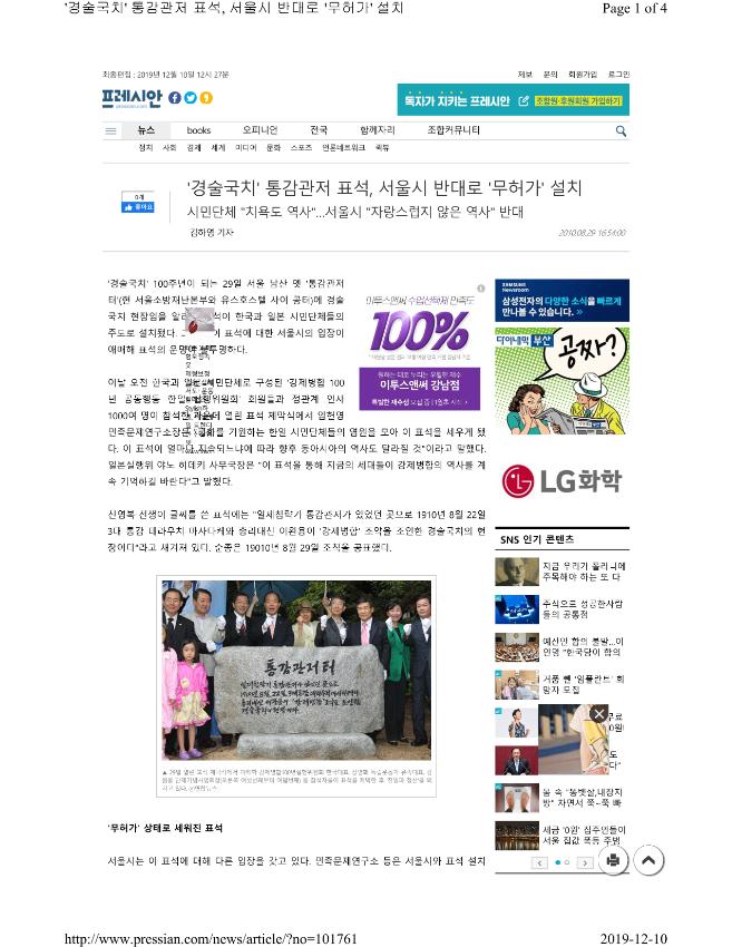 시민단체 "치욕도 역사"…서울시 "자랑스럽지 않은 역사" 반대 김하영 기자 2010.08.29 16:54:00 '경술국치' 통감관저 표석, 서울시 반대로 '무허가' 설치 '경술국치' 100주년이 되는 29일 서울 남산 옛 '통감관저 터'(현 서울소방재난본부와 유스호스텔 사이 공터)에 경술국치 현장임을 알리는 표석이 한국과 일본 시민단체들의 주도로 설치됐다. 그런데 이 표석에 대한 서울시의 입장이 애매해 표석의 운명이 불투명하다. 이날 오전 한국과 일본 시민단체로 구성된 '강제병합 100년 공동행동 한일 실행위원회' 회원들과 정관계 인사 1000여 명이 참석한 가운데 열린 표석 제막식에서 임헌영 민족문제연구소장은 "평화를 기원하는 한일 시민단체들의 염원을 모아 이 표석을 세우게 됐다. 이 표석이 얼마나 지속되느냐에 따라 향후 동아시아의 역사도 달라질 것"이라고 말했다. 일본실행위 야노 히데키 사무국장은 "이 표석을 통해 지금의 세대들이 강제병합의 역사를 계속 기억하길 바란다"고 말했다. 신영복 선생이 글씨를 쓴 표석에는 "일제침략기 통감관저가 있었던 곳으로 1910년 8월 22일 3대 통감 데라우치 마사다케와 총리대신 이완용이 '강제병합' 조약을 조인한 경술국치의 현장이다"라고 새겨져 있다. 순종은 19010년 8월 29일 조칙을 공표했다. ▲ 29일 열린 표석 제막식에서 이해학 강제병합100년실행위원회 한국대표, 장병화 독립운동가 유족대표, 김원웅 단재기념사업회장(오른쪽 여섯번째부터 여덟번째) 등 참석자들이 표석을 제막한 후 '친일파 청산'을 외치고 있다. ⓒ연합뉴스 '무허가' 상태로 세워진 표석 서울시는 이 표석에 대해 다른 입장을 갖고 있다. 민족문제연구소 등은 서울시와 표석 설치에 대해 협의했지만 결론을 내지 못했다. 서울시는 지난 18일 '표석설치자문위원회'를 열어 "자랑스러운 역사가 아니며, 국민 정서상 반감을 가지는 경향이 강하므로 (경술국치) 표석 설치는 재고해야 한다"며 '통감관저 터'라는 표석 설치에 반대 의견을 낸 것으로 알려졌다. 그러면서 다른 이름의 표석을 세울 계획이다. 이 자리에는 원래 조선 철종 때 만들어진 '녹천정'(鹿川亭)이라는 정자가 있었는데 1884년 갑신정변 때 일본 공사관이 불에 타자 일본이 이 터를 빼앗아 정자를 허물고 새로 공사관을 지었으며, 1906년부터는 통감관저로 쓰였다. 강제병합 이후에는 1939년까지 총독관저로 사용됐다. 이에 서울시는 오는 10월께 '녹천정 터'라는 표석을 세울 계획인 것으로 알려졌다. 결국 민족문제연구소 측은 서울시와 합의하지 못해 일종의 '무허가' 상태인 셈이다. 이해학 한국실행위 상임대표는 이날 제막식에서 "가슴 아픈 역사가 시작된 이 곳에 표석을 세우자고 서울시에 건의했으나, 시는 '녹천정 터'로 이름을 변경하자고 말하는 등 수치를 감추려고만 했다"며 "치욕의 역사라 할지라도 이를 보존하는 것이 후세를 위한 길"이라고 서울시를 비판했고, 임헌영 소장도 "나라를 빼앗긴 것도 부끄럽지만 그 사실을 안타까워 하지 않는 현실도 부끄럽다"고 말했다. 민족문제연구소 조세열 사무총장은 "흔적도 남아 있지 않은 녹천정이라는 정자에 어떤 역사적 의미가 있는지 모르겠다"면서 "서울시가 설마 강제 철거를 하지는 않겠지만, 한 자리에 나란히 '통감관저' 표석과 '녹천정' 표석이 세워질 지도 모르겠다"고 씁쓸해 했다. 프레시안