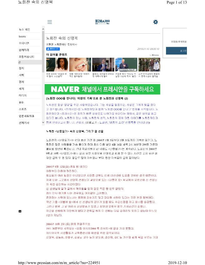 노회찬 속의 신영복 [노회찬 OOO를 만나다] '미완의 기록'으로 본 노회찬과 신영복 (2) 조현연 노회찬재단 특임이사 2019.01.16 09:06:10 노회찬은 항상 '영감'을 주던 사람이었습니다. 그는 세상을 등졌지만, 세상은 그에게 빚을 졌다고 생각합니다. <프레시안>은 노회찬재단과 함께 '노회찬 OOO를 만나다' 연재를 시작합니다. 노회찬재단과 <프레시안>은 정치가 바른 방향으로 나아가길 바란다는 점에서, 같은 생각을 품고 있다고 봅니다. 노회찬이 만난 사람, 노회찬의 생각, 노회찬의 꿈에 대한 이야기를 노회찬재단과 함께 연재하고자 합니다. 편집자. (바로보기 : 노회찬, '마음의 스승' 신영복을 만나다 (1)) 노회찬 <난중일기> 속의 신영복, 그리고 글 선물 노회찬의 <난중일기>는 17대 총선 기간 중 2004년 1월 5일부터 3월 31일까지 기록한 일기다. 노회찬은 많은 사람들을 가슴 졸이게 하며 총선 다음 날인 4월 16일 새벽 2시 30분경 299명 가운데 꼴찌로 당선이 확정된다. 17대 국회의원이 된 뒤 노회찬의 2004년 9월과 10월 <난중일기>에는 피치 못할 사정으로 신영복과 함께 할 수 있는 시간을 갖지 못한 데 대한 글이 두 편 있다. 정말로 많이 아쉬웠나 보다. 찐한 아쉬움이 글에 묻어난다. 2004년 9월 12일(일) 종일 비 내리다 아침부터 마음이 허전하다. 토요일의 여러 일정만 아니었으면 지금쯤 강원도 인제 미산리에 있었을 것이란 생각 때문이다. 어제 밤은 그곳에서 신영복 선생님이 교장으로 있는 <더불어 숲> 학교에서 오랜만에 신 선생님이 직접 강의하는 시간이었다. 신 선생님의 말과 글에서 깨우침을 얻지 않은 적은 한 번도 없었다. 잠시 만나 얘기를 나눈 경우에도 여지없이 그러했다. 존경하는 사람이 있느냐는 물음에 망설이지 않고 대답할 사람이 있다는 것은 분명 행복이다. 작년 가을 <더불어 숲>에서 신 선생님의 강의가 있을 때도 수강신청을 하고 회비를 송금했다. 그러나 바로 그 날 이라크 파병발표가 있었고 청와대 앞에서 항의 기자회견이 잡혔다. 이근성 선배에게 미안하게 됐다고 연락을 하자 이 선배는 다음 강의라도 오라고 했는데 어느덧 1년이 지났다. 2004년 10월 2일 (토) 맑음 한파주의보 19시 30분부터 시작되는 <외침 아시아2004 록 콘서트>에 끝내 가지 못했다. 아시아지역 시민활동가 교육훈련비용 마련을 위한 음악회이다. 신영복, 김동춘, 한홍구, 김창남 교수 등이 윤도현, 강산에, 김C 등 가수와 함께 록을 부르는 기괴한 장면을 목격하지 못한 것은 오로지 국감 탓이다. 2005년 2월 21일 오전 노회찬 의원실 관계자가 국회 기자회견장에 들러 '신세대 맞춤형 의정보고서'라고 할 수 있는 'CD' 형태의 영상 다큐멘터리 의정보고서를 기자들에게 돌린다. 이 의정보고서는 신영복이 노회찬에게 보내준 "꽃이되어바람이되어”라는 타이틀로 제작됐다. 의정보고서는 △2004국정감사, 피감기관 의정활동 평가 1위 △굴욕적 용산미군기지 협상 문제제기 △국가보안법 폐지 △민생 인권을 위한 입법활동 △당과 함께 대중과 함께 등 5부로 구성돼 있으며 35분 분량의 동영상이다. 2009년 9월 6일 노회찬(진보신당 대표)은 이 글씨를 액자에 담아 '전국언론노동조합 언론악법 원천무효 시민바자회' 경매물품으로 내놓는다. 노회찬은 경매 시작 전 발언에서 우리 집에서 가장 비싼 물건을 가져오려 하였으나 아내에 반대에 부딪쳐 두 번째로 비싼 물건을 가져 왔다고 하며 제일 비싼 것은 바로 저라고 하여 바자회를 찾은 시민들에게 웃음까지 선물한다. 이어 노회찬은 이 물품이 희망가 이상으로 팔리게 되면 을지면옥의 냉면과 빈대떡을 대접하겠노라고 약속을 하기도 하였다. (※ 참고로, 아는 사람은 다 아는 사실이지만 노회찬은 평양냉면 광이다. 수도권의 소문난 평양냉면집은 거의 다 가봤을 정도이고, 평양을 방문했을 때는 옥류관 냉면이 너무 맛있어 여섯 그릇 먹고 특별방문록에 서명했다는 일화도 남겼다.) 바자회를 성공적으로 마친 최상재(전국언론노조 위원장)는 이렇게 인사한다. "여러분의 관심과 참여 속에 정말 많은 분들이 오셔서 언론자유를 다시 생각하고 지금 기울어져가는 민주주의를 염려하는 마음을 나누었습니다. 정말 모두가 주인이었고 모두가 참여자였습니다. 그리고 결국 이 바자회를 통해 6천만원이 넘는 소중한 기금이 마련됐습니다. 이 기금은 언론악법 원천무효와 언론자유 수호를 위해 소중하게 사용될 것입니다."