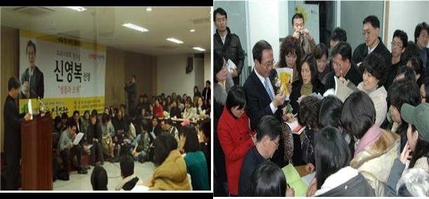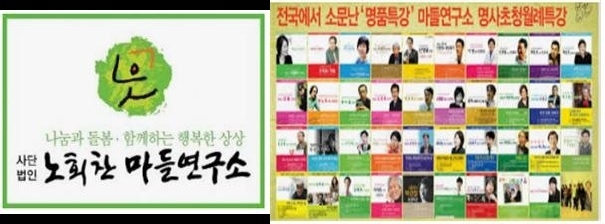 ▲ 정년퇴임식에서 신영복, 노회찬. <감옥으로부터의 사색> 외에 가장 좋아하는 책이자, '신영복 문학의 백미'로 노회찬은 <청구회추억>을 꼽는다. 2008년 8월 28일 <노회찬의 난중일기>는 '청구회 추억'에 얽힌 개인적 추억을 이렇게 말하고 있다. 8월 28일 (금) 맑음 <청구회 추억>은 이른바 <신영복 문학>의 백미이다. (…) <청구회 추억>은 사형선고를 받은 신영복 선생이 1969년 남한산성 육군교도소에서 유품을 미리 정리하듯 남긴 글이다. <청구회>란 1966년 서오릉 소풍길에서 우연히 만난 여섯 명의 꼬마들과 인연을 맺으며 만든 모임 이름이며 이들과의 2년에 걸친 만남의 기록이 <청구회 추억>이다. 1992년 출소 이후 진보정당건설운동에 매진하던 시절 나는 만나는 사람들에게 <감옥으로부터의 사색>과 함께 늘 <청구회 추억>을 권하곤 했다. 활동가라면 특히 조직사업을 하는 활동가라면 마땅히 읽어보아야 할 책이라고 강변했던 기억이 난다. 그땐 1991년 월간중앙에 게재된 글의 복사본밖에 없어 마치 유인물 건네듯 이 복사본을 손에 쥐어 주곤 했다. 구미의 조근래 동지는 이 복사본 <청구회 추억>을 읽고 신영복 선생을 주례로 모시고 싶다고 해서 신 선생을 모시고 구미까지 내려간 일도 있었다. 얼마 후 조근래 동지는 <청구회 추억>을 수첩만한 크기로 만든 책자를 나에게 보내오기도 했다. (…) <청구회 추억>은 이렇게 돌려가며 읽혀졌다. 그 후 <엽서>가 발간되면서 육군교도소 똥종이에 쓰여진 육필원고가 영인본으로 실리고, 부록처럼 다른 책에 함께 실리기도 했었다. 그래도 이 글이 단행본으로 출간되어 더 많이 읽혔으면 하는 바람을 식힐 순 없었다. 27일 선재아트센터에서 <청구회 추억> 출간을 기념하는 북콘서트가 열렸다. 강당은 만원이고 통로와 계단까지 선남선녀로 가득 찼다. (…) <청구회 추억> 출간 기념회이기도 하지만 마침 <감옥으로부터의 사색> 20주년이 되는 시점이고 돌이켜보면 20년을 옥중에서 보낸 신영복선생의 <바깥세상 체험 20년>도 되는 터이라 신 선생의 인사말은 그에 걸맞는 '작은 강연'이 되었다. (…) 이 날도 신 선생은 세상에서 가장 긴 여행은 머리에서 가슴까지 가는 길이라 했다. 가슴에서 발(실천을 뜻한다)까지 가는 여행은 더 힘들다는 말도 덧붙이셨다. 우리는 어디까지 와 있나? 머리에서 출발하여 귀, 눈, 혹은 입까지 와서 머물고 있는 것은 아닌가? 수십년 운동을 하면서 칼날같이 날카롭게 맞선 상대가 아니라 함께 하는 동지들로부터 더 큰 상처를 받은 사람들을 많이 보아왔다. 스스로 올바르다는 생각에 빠져 쉽게 상처를 안겨주고, 또 상처를 받았다는 생각에서 그에 못지않은 상처를 주는데 주저함이 없다. 자신이 안긴 상처는 기억하지 못하고 자신이 입은 상처만 바라보니 남는 것은 '상처 입은 피해자'들뿐이다. 이날 강연 중에서 신 선생은 독서란 3독이라 말하셨다. 텍스트(책의 내용)를 읽고 책쓴이를 읽고 동시에 자신을 읽는다고 해서 3독이라는 것이다. 마침 선선한 밤공기가 책읽기에 적절하다. <청구회 추억>이 우리들의 현재가 되길 바라며 3독을 권한다. <노회찬마들연구소> 명사초청특강: "성찰과 모색" 2008년 18대 총선에서 석패한 노회찬은 11월 28일 지역 정당활동의 모범을 만들기 위해 노원구 상계동에 <노회찬마들연구소>를 설립, 창립기념식을 치렀다. 축하와 격려의 의미로 신영복은 '노회찬마들연구소' 제호를 글로 써서 선물한다. 2009년 1월 7일 신영복은 노회찬이 이사장으로 있는 <노회찬마들연구소> 명사초청특강에서 "성찰과 모색"이라는 주제로 강연을 한다. 연구소의 '명사초청특강'은 2008년 9월 7일부터 2012년 9월 26일까지 4년 동안 총 41회를 진행하면서 '지역명품특강'으로 장안의 화제를 몰고오기도 했다. 강연장인 노원역 인근 서울북부고용지원센터는 발 디딜 틈도 없이 500여 청중들이 빽빽이 메웠다. 여러 울림의 이야기를 들려주었지만 그 가운데서 '물'에 대한 신영복의 이야기를 옮겨본다. "인간의 관계성을 가장 나타내는 것이 물입니다. 우리가 희망을 만들기 위해서는 물로서 배워야 합니다. 물은 항상 낮은 곳으로 흐르지요. 다투지 않습니다. 바위를 만나면 돌아가고 절벽을 만나면 뛰어내리고 큰 웅덩이를 만나면 건너뛰지 않고 차곡차곡 쌓여서 넘칩니다. 이러한 물의 자기 변화를 우리는 배워야 합니다. 그리고 매우 중요하게 배울 점이 또 있습니다. 물은 낮은 곳으로 흐른다는 점입니다. 바로 하방연대(下方連帶), 낮은 곳과의 연대입니다."