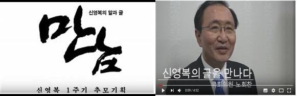 2017년 1월 17일 <[신영복 1주기 추모기획: 만남] 신영복의 글을 만나다 국회의원 노회찬>(https://youtu.be/_UK-uYrscb8)을 통해 노회찬은 신영복이 '정치'에 대해 말한 글을 읽는다. 5월 15일 스승의 날에는 유고집인 <냇물아 흘러흘러 어디로 가니>와 <손잡고 더불어: 신영복과의 대화>에 카네이션 꽃을 올린다.