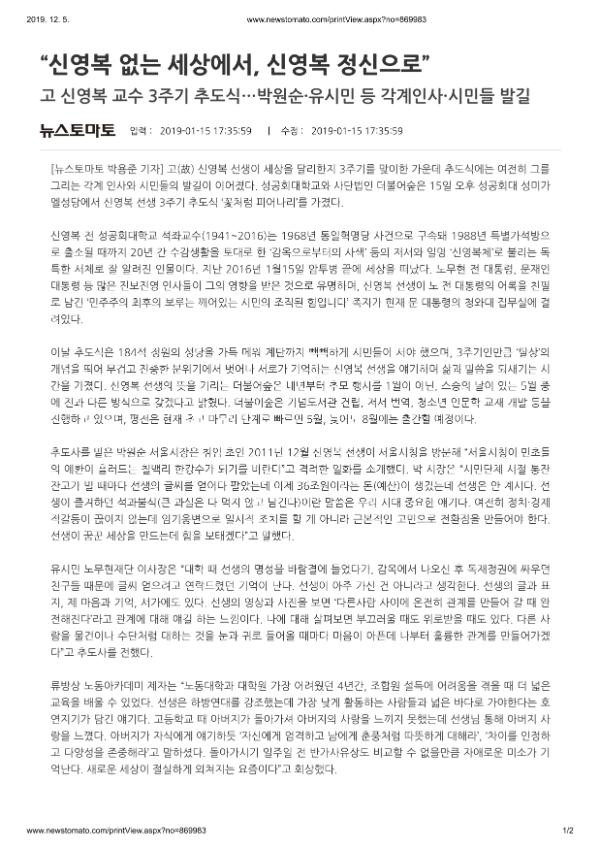 “신영복 없는 세상에서, 신영복 정신으로” 고 신영복 교수 3주기 추도식…박원순·유시민 등 각계인사·시민들 발길 입력 : 2019-01-15 17:35:59 ㅣ수정 : 2019-01-15 17:35:59 [뉴스토마토 박용준 기자] 고(故) 신영복 선생이 세상을 달리한지 3주기를 맞이한 가운데 추도식에는 여전히 그를 그리는 각계 인사와 시민들의 발길이 이어졌다. 성공회대학교와 사단법인 더불어숲은 15일 오후 성공회대 성미가엘성당에서 신영복 선생 3주기 추도식 ‘꽃처럼 피어나리’를 가졌다. 신영복 전 성공회대학교 석좌교수(1941~2016)는 1968년 통일혁명당 사건으로 구속돼 1988년 특별가석방으로 출소될 때까지 20년 간 수감생활을 토대로 한 ‘감옥으로부터의 사색’ 등의 저서와 일명 ‘신영복체’로 불리는 독특한 서체로 잘 알려진 인물이다. 지난 2016년 1월15일 암투병 끝에 세상을 떠났다. 노무현 전 대통령, 문재인 대통령 등 많은 진보진영 인사들이 그의 영향을 받은 것으로 유명하며, 신영복 선생이 노 전 대통령의 어록을 친필로 남긴 ‘민주주의 최후의 보루는 깨어있는 시민의 조직된 힘입니다’ 족자가 현재 문 대통령의 청와대 집무실에 걸려있다. 이날 추도식은 184석 정원의 성당을 가득 메워 계단까지 빽빽하게 시민들이 서야 했으며, 3주기인만큼 ‘탈상’의 개념을 띄어 무겁고 진중한 분위기에서 벗어나 서로가 기억하는 신영복 선생을 얘기하며 삶과 말씀을 되새기는 시간을 가졌다. 신영복 선생의 뜻을 기리는 더불어숲은 내년부터 추모 행사를 1월이 아닌, 스승의 날이 있는 5월 중에 전과 다른 방식으로 갖겠다고 밝혔다. 더불어숲은 기념도서관 건립, 저서 번역, 청소년 인문학 교재 개발 등을 진행하고 있으며, 평전은 현재 초고 마무리 단계로 빠르면 5월, 늦어도 8월에는 출간할 예정이다. 추도사를 맡은 박원순 서울시장은 취임 초인 2011년 12월 신영복 선생이 서울시청을 방문해 “서울시청이 민초들의 애환이 흘러드는 칠백리 한강수가 되기를 바란다”고 격려한 일화를 소개했다. 박 시장은 “시민단체 시절 통잔잔고가 빌 때마다 선생의 글씨를 얻어다 팔았는데 이제 36조원이라는 돈(예산)이 생겼는데 선생은 안 계시다. 선생이 즐겨하던 석과불식(큰 과실은 다 먹지 않고 남긴다)이란 말씀은 우리 시대 중요한 얘기다. 여전히 정치·경제적갈등이 끊이지 않는데 임기웅변으로 일시적 조치를 할 게 아니라 근본적인 고민으로 전환점을 만들어야 한다. 선생이 꿈꾼 세상을 만드는데 힘을 보태겠다”고 말했다. 유시민 노무현재단 이사장은 “대학 때 선생의 명성을 바람결에 들었다가, 감옥에서 나오신 후 독재정권에 싸우던 친구들 때문에 글씨 얻으려고 연락드렸던 기억이 난다. 선생이 아주 가신 건 아니라고 생각한다. 선생의 글과 표지, 제 마음과 기억, 서가에도 있다. 선생의 영상과 사진을 보면 ‘다른사람 사이에 온전히 관계를 만들어 갈 때 완전해진다’라고 관계에 대해 얘길 하는 느낌이다. 나에 대해 살펴보면 부끄러울 때도 위로받을 때도 있다. 다른 사람을 물건이나 수단처럼 대하는 것을 눈과 귀로 들어올 때마다 마음이 아픈데 나부터 훌륭한 관계를 만들어가겠다”고 추도사를 전했다. 류방상 노동아카데미 제자는 “노동대학과 대학원 가장 어려웠던 4년간, 조합원 설득에 어려움을 겪을 때 더 넓은 교육을 배울 수 있었다. 선생은 하방연대를 강조했는데 가장 낮게 활동하는 사람들과 넓은 바다로 가야한다는 호연지기가 담긴 얘기다. 고등학교 때 아버지가 돌아가셔 아버지의 사랑을 느끼지 못했는데 선생님 통해 아버지 사랑을 느꼈다. 아버지가 자식에게 얘기하듯 ‘자신에게 엄격하고 남에게 춘풍처럼 따뜻하게 대해라’, ‘차이를 인정하고 다양성을 존중해라’고 말하셨다. 돌아가시기 일주일 전 반가사유상도 비교할 수 없을만큼 자애로운 미소가 기억난다. 새로운 세상이 절실하게 외쳐지는 요즘이다”고 회상했다. 조희연 서울시교육감은 “교수들끼리 정기적으로 서예모임을 가졌는데 제 실력이 모자라니 제 손을 잡고 낙관까지 그려주던, 잔정 많고 작은 것까지 배려하던 친구이자 스승의 3주기다. 무한경쟁, 각자도생, 승자독식만을 외치는 요즘 한 사람의 열 발자국보다 열 사람의 한 발자국이 의미있다는 가르침은 공감을 불러오지만 문구로만 남아있는 현실이다. 선생께선 저마다 누군가의 제자이자 스승으로 ‘스승이 될 수 없다면 진정한 친구가 될 수 없고, 친구가 될 수 없다면 진정한 스승이 될 수 없다’고 얘기했다. 3주기 탈상이다. 이제 우리는 신영복 없는 세상에서 신영복 정신과 시선으로 저마다 ‘리틀 신영복’이 돼 살아야 한다. 빈자리를 어떻게 메울지 고민이다”고 말했다. 15일 오후 서울 성공회대 성미가엘성당에서 열린 신영복 선생 3주기에 유시민 노무현재단 이사장(좌측부터), 류방상 노동아카데미 제자, 조희연 서울시교육감, 박원순 서울시장 등이 참석했다.