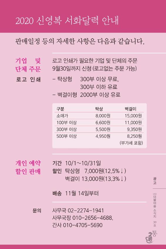 - 탁상형 300부 이상 무료, 300부 이하 유료, 로고없는 탁상형 주문 가능 - 벽걸이형(유료) 2000부 이상부터 가능.
