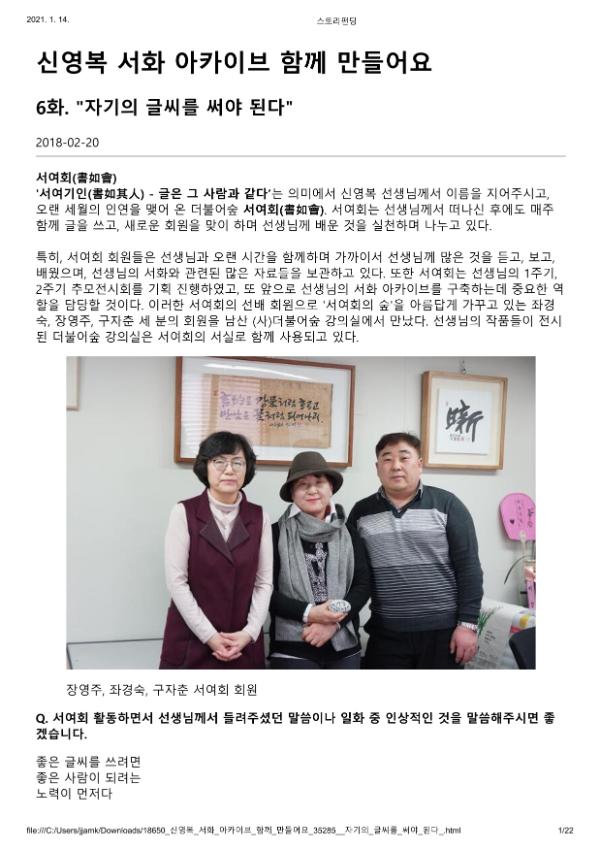 '서여기인(書如其人) - 글은 그 사람과 같다’는 의미에서 신영복 선생님께서 이름을 지어주시고, 오랜 세월의 인연을 맺어 온 더불어숲 서여회(書如會). 서여회는 선생님께서 떠나신 후에도 매주 함께 글을 쓰고, 새로운 회원을 맞이 하며 선생님께 배운 것을 실천하며 나누고 있다.