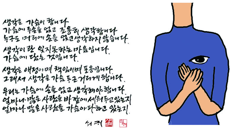 본문 : 생각은 가슴이 합니다 가슴에 두손을 얹고 조용히 생각합니다 누구도 머리에 손을 얹고 생각하지 않습니다. 생각이란 잊지못하는 마음입니다. 가슴에 담는 것입니다. 생각은 애정이며 책임이며 포옹입니다. 그래서 생각은 가슴 두근거리게합니다. 우리는 가슴에 손을 얹고 생각해야 합니다. 얼마나 많은 사람을 바깥에서 세워두고 있는지 얼마나 많은 사람을 가슴아파하고 있는지.