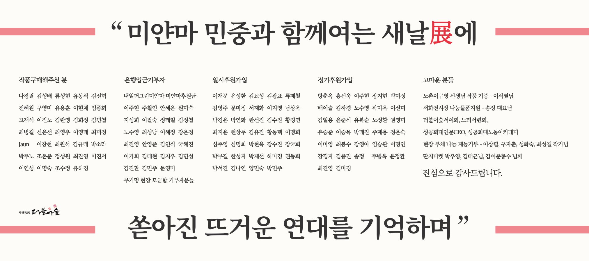 탐욕스러운 군부 독재 권력이 적나라한 폭력을 동원해 민주주의를 짓밟고 있는 미얀마의 모습은 불과 몇십 년 전 이 땅의 현실을 상기하게 합니다. 이번 전시회의 뜻에 공감하고 선뜻 마음을 보태주신 많은 분들도 그런 기억을 떠올리셨으리라 생각합니다. 다행히 우리는 적지 않은 희생과 노력으로 민주화의 길을 찾을 수 있었습니다. 지금 절망의 어두운 시간을 겪고 있는 미얀마의 민중들도 머지않아 희망의 아침으로 나아가게 되리라 믿습니다. 지금 우리가 보내는 작은 정성이 그 시간을 앞당기는 데 기여하게 되길 바랍니다.