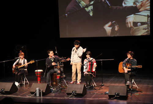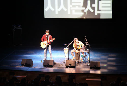 ㆍ“여럿이 함께 가면 길이 생긴다” 무대 위에서 이야기를 나누고 있는 탁현민 교수(왼쪽)와 신영복 교수. 두 사람은 스승과 제자 사이이기도 하다. 1월 25일 카타르 도하의 알 가라파 스타디움에서 아시안컵 4강전 한·일전이 열렸던 날, 탁현민 성공회대 겸임교수도 긴장했다. 축구경기의 승패 때문이 아니다. 축구 한·일전이 벌어졌던 날은 <주간경향>과 탁 교수가 함께 하는 장기 프로젝트 ‘탁현민의 시사콘서트’가 처음으로 선보이는 날이기도 했다. 시사콘서트는 처음부터 축구 한·일전에 맞서(?)는 ‘무한도전’이었던 것. 시사 강연과 인디 밴드의 공연이 잘 어우러질 수 있을까 하는 우려는 공연 내내 계속됐다. 하지만 우려는 우려에 불과했다. ‘시사콘서트’라는 특별한 형식의 공연은 관객들에게 뜨거운 호응을 받았다. 신영복 교수 “출소 이후 진짜 자유 고민” 1월 25일 저녁 7시부터 8시까지 서울 정동 이화여고 100주년기념관(430석 규모)에는 400명을 훌쩍 뛰어넘는 관객들이 몰려왔다. 관객석이 거의 차서 공연을 준비하던 스태프들이 정신없이 뛰어다녀야 했다. 공연 시작 30분 전부터 티켓 교환처에는 길게 줄이 늘어서기 시작했다. 티켓을 교환하기 위해 줄을 선 관객들 사이에서는 “이렇게 사람이 몰려들 줄 몰랐다”며 놀라는 모습들이 보였다. 김창남·김진업·박경태 성공회대 교수가 참여하고 있는 직장인 밴드 ‘더숲 트리오’. 예약자들이 공연장에 모두 들어온 8시 15분, 공연장의 불이 꺼졌다. 무대에 설치된 화면에 이날 사회를 맡은 탁현민 교수의 소개 영상이 흘러나왔다. 마치 콘서트장에서나 볼 수 있었던 재기 넘치고 흥겨운 영상에 관객들은 박수와 환호로 화답했다. 입담 좋은 ‘일단은, 준석이들’ 밴드가 들썩이는 공연장 분위기를 한껏 달아오르게 했다. 기타를 치고 타악기를 두드리면서 관객들의 박수와 환호성을 이끌어냈다. “탁 교수가 트위터에 홍보를 할 때 우리를 ‘등’이라고 소개했는데, 우리의 이름은 ‘일단은, 준석이들’이다(탁 교수가 트위터로 시사콘서트 홍보를 할 때 ‘더숲트리오’ ‘좋아서 하는 밴드’ 등이 출연한다고 했던 글을 이야기함)”라는 우스개에 관객들의 웃음이 터졌다. 오프닝 공연이 끝나자 탁 교수가 천사 날개를 등에 달고 무대에 등장했다. 관객들이 박수와 웃음으로 맞이했다. ‘현빈 대신 현민’이라고 쓴 종이를 들고 온 관객의 모습이 무대 화면에 비치자 관객석은 웃음과 환호성으로 들썩였다. 1만3000여명의 트위터 팔로어를 가지고 있는 탁 교수의 인기를 보여주는 장면이었다. 첫 번째 시사콘서트는 400여개의 객석을 모두 채울 만큼 큰 호응을 얻었다. 탁 교수가 “관객들에게 줄 선물”이라며 무대에 ‘안상수표 폭탄’인 ‘보온병’을 내놓았다. 탁 교수는 “눈에 보이는 것 이상을 이야기하고, 상상력을 자극한다”는 말로 안상수 한나라당 대표를 평가했다. 이날 탁 교수가 관객석에 던진 질문은 “이명박 대통령 때문에 나의 삶이 바뀐 것”이었다. 탁 교수는 트위터에 올라왔던 “누구도 그보다 낫다. 사람에 대한 이해가 넓어졌다” 등의 글을 소개했다. 탁 교수의 유머에 관객들은 마냥 즐겁게 웃었다. 이날 강연자인 신영복 성공회대 석좌교수가 소개됐다. 보통의 강연장과는 다른 분위기에 “이런 분위기인지 몰랐다. 제자이자 같은 학교 선생인 탁 교수에게 낚인 것 같다”면서 웃었다. 함께 웃고 떠들던 공연장은 신 교수의 등장으로 일순간 차분해졌다. 이날 신 교수는 “자유는 ‘자기의 이유로 걸어가는 것’”이라는 주제의 강연을 관객들에게 펼쳐놓았다. 신 교수의 강연이 시작되자 ‘노트에 무언가를 적는 관객’ ‘휴대전화로 동영상을 촬영하는 관객’이 보였다. 관객들은 신 교수의 말 한마디 한마디에 집중하기 시작했다. 강연이 시작되자 왁자지껄했던 공연장은 대학 강의실처럼 조용한 공간으로 변했다. “감옥에 있을 때는 자유는 무조건 출소였다. 일단 감옥만 벗어나면 자유라고 생각했다. 그런데 출소 이후에 진짜 자유가 무엇인지를 생각하게 됐다”면서 “오늘은 여러분과 자유에 대해 이런 저런 생각을 같이 공유해보는 시간이었으면 좋겠다”며 강연을 시작했다. 시사콘서트의 고정을 노리는 ‘일단은, 준석이들’ 밴드는 재미있는 입담으로 관객들의 사랑을 받았다. 신 교수는 컴퓨터에 준비해온 강연 내용을 무대 화면에 비춰가면서 강연을 이어나갔다. 20년 동안 감옥에서 겪었던 다양한 경험을 곁들이면서 자칫 무거울 수 있는 강연의 완급을 조절했다. ‘나무가 혼자 있을 때보다 숲속에 있을 때 진정한 자유가 있는 것’이라고 결론을 내렸다. ‘연대’와 ‘관계’의 중요성을 강조한 것. “감옥은 나의 대학이었다. 처음 나도 근대적인 문맥에 갇혀 있었다. 감옥에 있는 재소자를 대상화하고 타자화하고 분석했다. 그런데 그 사람들과 긴긴 밤을 서로 이야기하면서 (근대적인 문맥을) 많이 깼고, 그들을 차츰 이해하게 됐다. 공감하게 된 것이다.” 알아서 관람료 내는 후불제 공연 강연 예정시간 50분을 훌쩍 넘어 1시간이 지나갔다. 신 교수는 “여럿이 함께 가면 길이 생긴다. 자유는 성찰이며 변