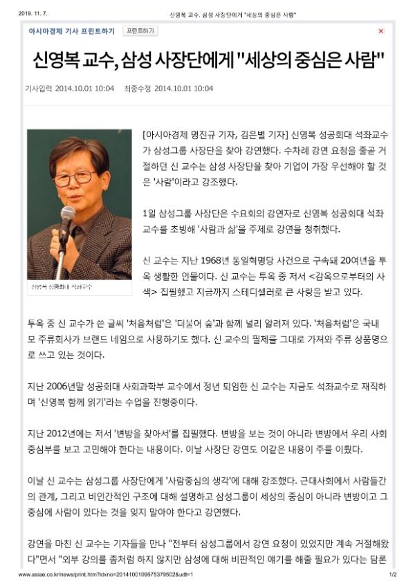신영복 성공회대 석좌교수가 삼성그룹 사장단을 찾아 강연했다. 수차례 강연 요청을 줄곧 거절하던 신 교수는 삼성 사장단을 찾아 기업이 가장 우선해야 할 것은 '사람'이라고 강조했다. 1일 삼성그룹 사장단은 수요회의 강연자로 신영복 성공회대 석좌교수를 초빙해 '사람과 삶'을 주제로 강연을 청취했다. 신 교수는 지난 1968년 통일혁명당 사건으로 구속돼 20여년을 투옥 생활한 인물이다. 신 교수는 투옥 중 저서 <감옥으로부터의 사색> 집필했고 지금까지 스테디셀러로 큰 사랑을 받고 있다. 투옥 중 신 교수가 쓴 글씨 '처음처럼'은 '더불어 숲'과 함께 널리 알려져 있다. '처음처럼'은 국내 모 주류회사가 브랜드 네임으로 사용하기도 했다. 신 교수의 필체를 그대로 가져와 주류 상품명으로 쓰고 있는 것이다. 지난 2006년말 성공회대 사회과학부 교수에서 정년 퇴임한 신 교수는 지금도 석좌교수로 재직하며 '신영복 함께 읽기'라는 수업을 진행중이다. 지난 2012년에는 저서 '변방을 찾아서'를 집필했다. 변방을 보는 것이 아니라 변방에서 우리 사회 중심부를 보고 고민해야 한다는 내용이다. 이날 사장단 강연도 이같은 내용이 주를 이뤘다. 이날 신 교수는 삼성그룹 사장단에게 '사람중심의 생각'에 대해 강조했다. 근대사회에서 사람들간의 관계, 그리고 비인간적인 구조에 대해 설명하고 삼성그룹이 세상의 중심이 아니라 변방이고 그 중심에 사람이 있다는 것을 잊지 말아야 한다고 강연했다. 강연을 마친 신 교수는 기자들을 만나 "전부터 삼성그룹에서 강연 요청이 있었지만 계속 거절해왔다"면서 "외부 강의를 좀처럼 하지 않지만 삼성에 대해 비판적인 얘기를 해줄 필요가 있다는 담론이 있어 강연을 수락했고 수위 조절이 다소 어려웠지만 강연은 잘 마친것 같다"고 말했다. 신 교수는 세월호 사태를 빗대 노조문제를 제기했다. 세월호 사태의 시발점이 된 평형수를 노조에 비유하며 삼성이 노조나 하층민에 대한 필요성을 좀더 깨닫고 이를 받아들여야 한다고 강조했다. 신 교수는 "세월호 침몰의 주 원인이 평형수를 비워 증축했기 때문"이라며 "배의 평형수는 기업으로 치자면 노조나 하층민인데 삼성도 평형수가 부족해도 되는 존재가 아닌 꼭 필요한 존재로 인식해야 한다"고 말했다. 이어 "제왕권이 강하면 강할 수록 붕괴의 위험이 크다"면서 "진보는 빵(자본)이 아니고 사람이 돼야 한다는 점을 주지해야 할 것"이라고 말했다.